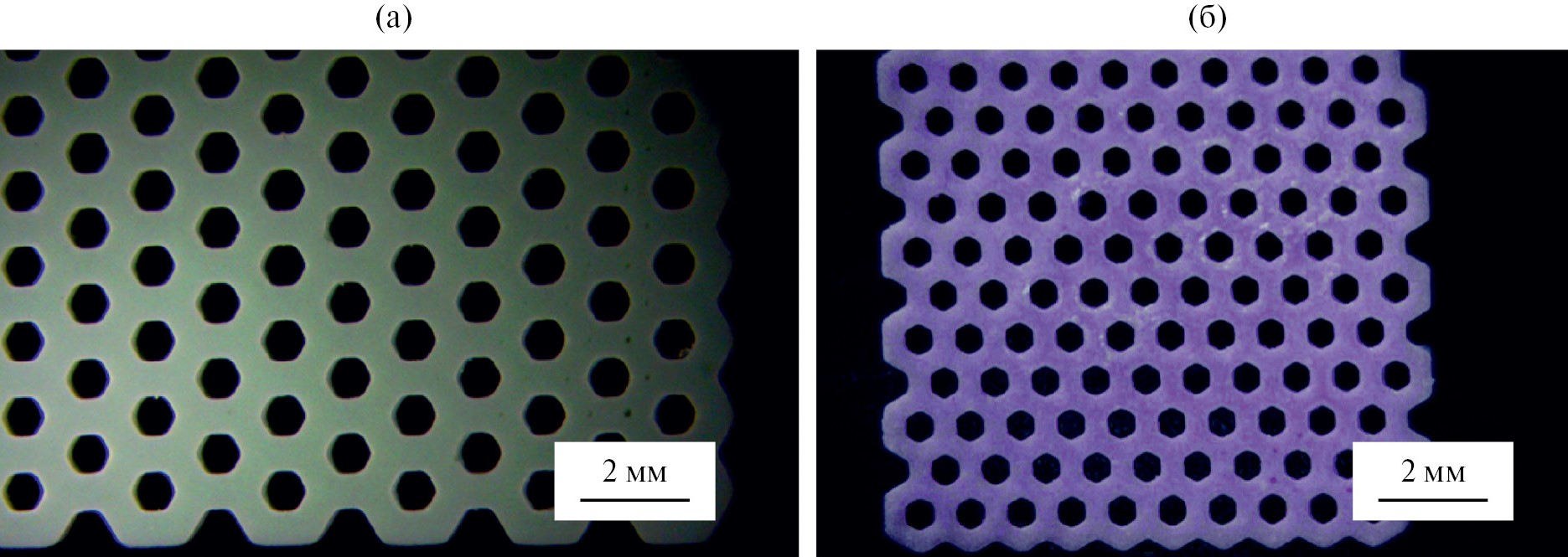 Рис. 4. Репрезентативные оптические фотографии: композит Al2O3/Cr2O3/HDDA после DLP 3D-печати (a) и керамика Al2O3:Cr3+ после высокотемпературного спекания при 1600 °С 2 ч (б) (размер отверстий в композите 760(20) мкм, расстояние между отверстиями 490(10) мкм; размер отверстий в керамике 580(20) мкм, расстояние между отверстиями 380(10) мкм)