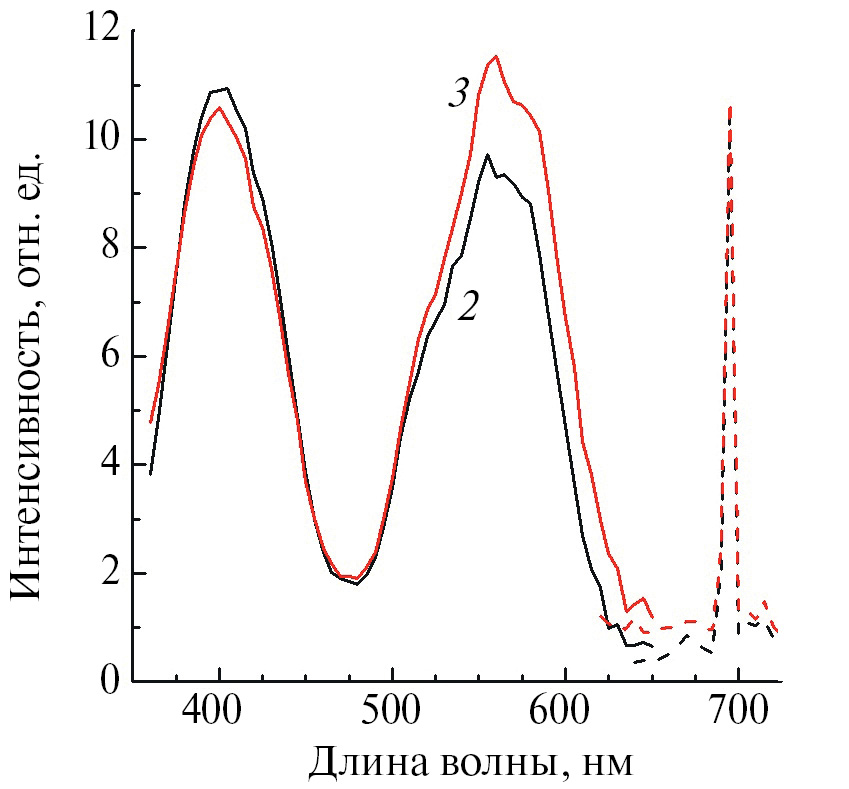 Рис. 5. Спектры ФЛ (λвозб = 403 нм) керамики Al2O3:Cr3+ и спектры возбуждения (λрег = 694 нм) керамики Al2O3:Cr3+: сплошные линии – спектры возбуждения ФЛ, штрихпунктирные линии – спектры ФЛ; черная и красная линии – образцы 2 и 3 соответственно (см. табл. 1)