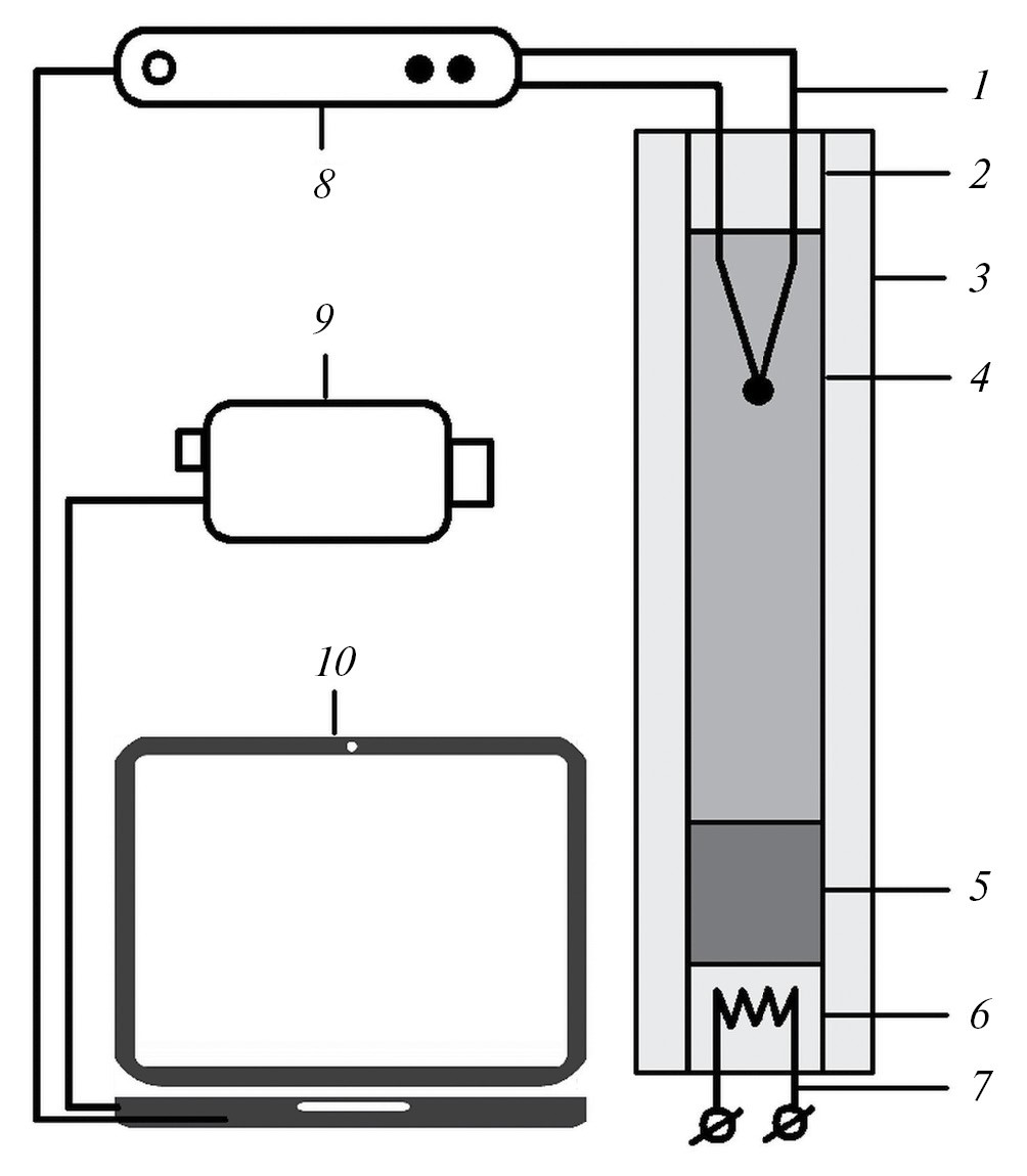 Рис. 1. Установка: 1 – термопара, 2 – изолятор, 3 – оболочка (внешний диаметр – De, внутренний – Di, длина – L0), 4 – прессовка (диаметр D = Di, длина – L), 5–7 – поджигающие прессовка, смесь и спираль, 8 – регистратор, 9 – видеокамера, 10 – компьютер