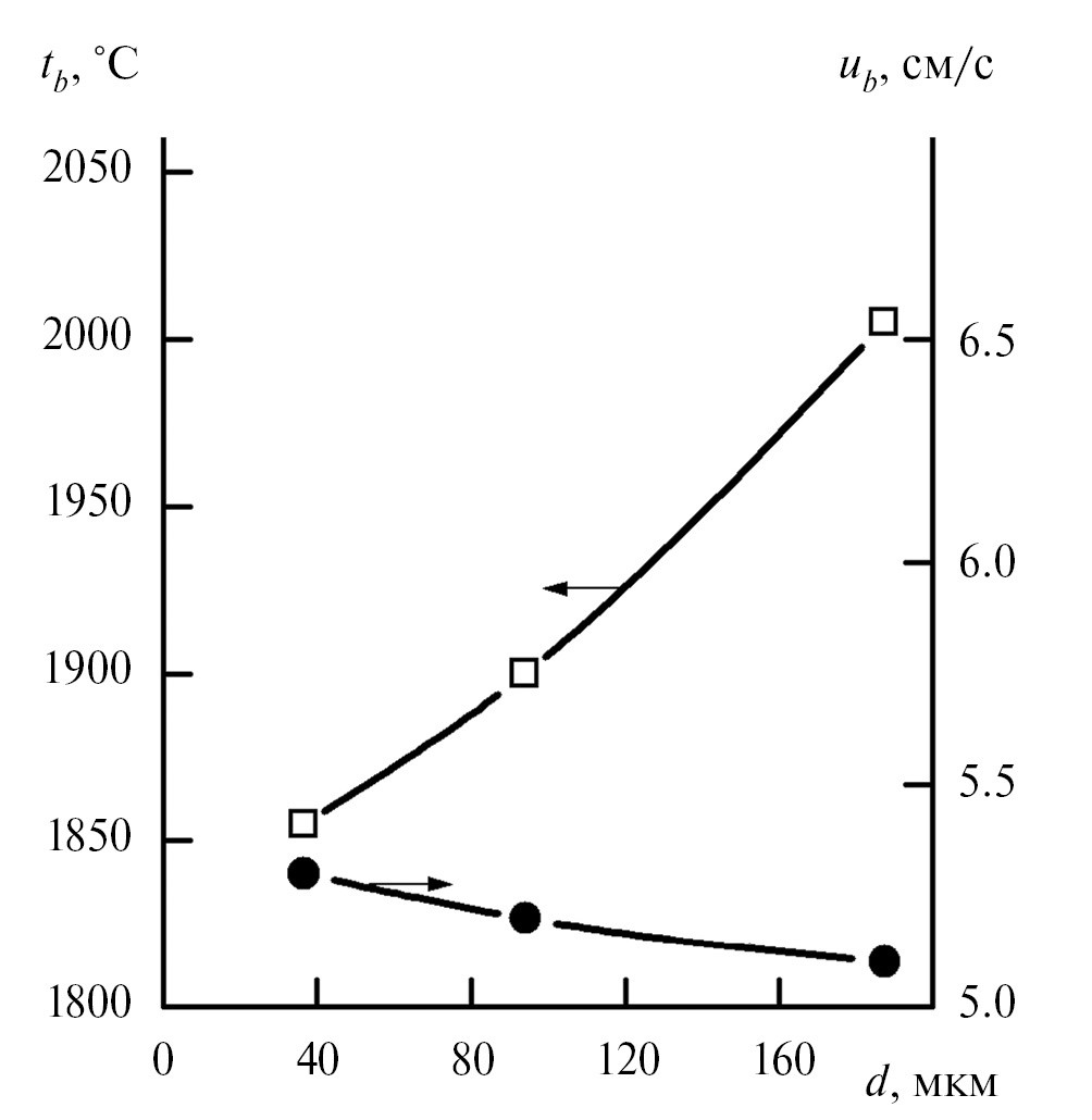 Рис. 2. Скорость и максимальная температура горения смесей в зависимости от среднего размера d гранул (3Ni + Al)m