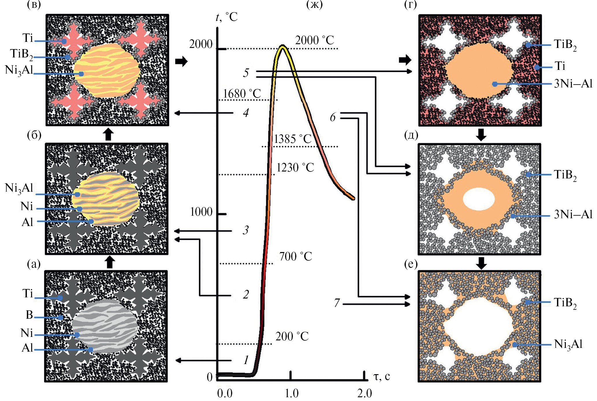 При 1230 °C начнется твердофазное взаимодействие титана и бора [19]. В поперечном слое реагирующая смесь Ti + 2В подобно “химической печке” будет передавать тепло в контактирующие с ней гранулы (3Ni + Al)m (продольное поступление тепла от горячей зоны волны горения продолжится). Поскольку дендритная форма частиц Ti препятствует плотному контакту по всей их поверхности с порошком бора (особенно при невысокой плотности прессовок), то слой продукта твердофазного взаимодействия на частицах Ti не будет сплошным и при достижении температуры плавления Ti (1668 °C) произойдет растекание расплава титана по капиллярам в порошке бора [7, 58–60]. При t > 1668 °C Ti и B будут не только продолжать взаимодействовать посредством диффузии через твердый слой продукта реакции, но и, при контакте расплава титана с бором, химически реагировать с более высокой скоростью, формируя пористый каркас из TiB2 [19] Расплав системы 3Ni–Al находится первоначально в виде “включений” в смеси Ti + 2В на месте гранул (при τ < 1668 °C, рис. 4г). При образовании TiB2 (при dt/dτ > 0, 1680 < t < 2000 °C) и при «догорании» (при dt/dτ < 0, 1385 < t < 2000 °C, рис. 4д, 4е) по мере просачивания расплава по порам диборидной матрицы образуется структура с “взаимопроникающими средами” из керамического каркаса и жидких интерметаллидов [19, 35, 38, 54–57]. Одновременно формируется пористое пространство продукта горения и возникают крупные поры на месте композитных гранул. Дальнейшее остывание (t < 1385 °C) ведет к окончательному формированию в продукте горения структуры из твердых каркасов диборид титана–алюминиды никеля и пор (рис. 4е).