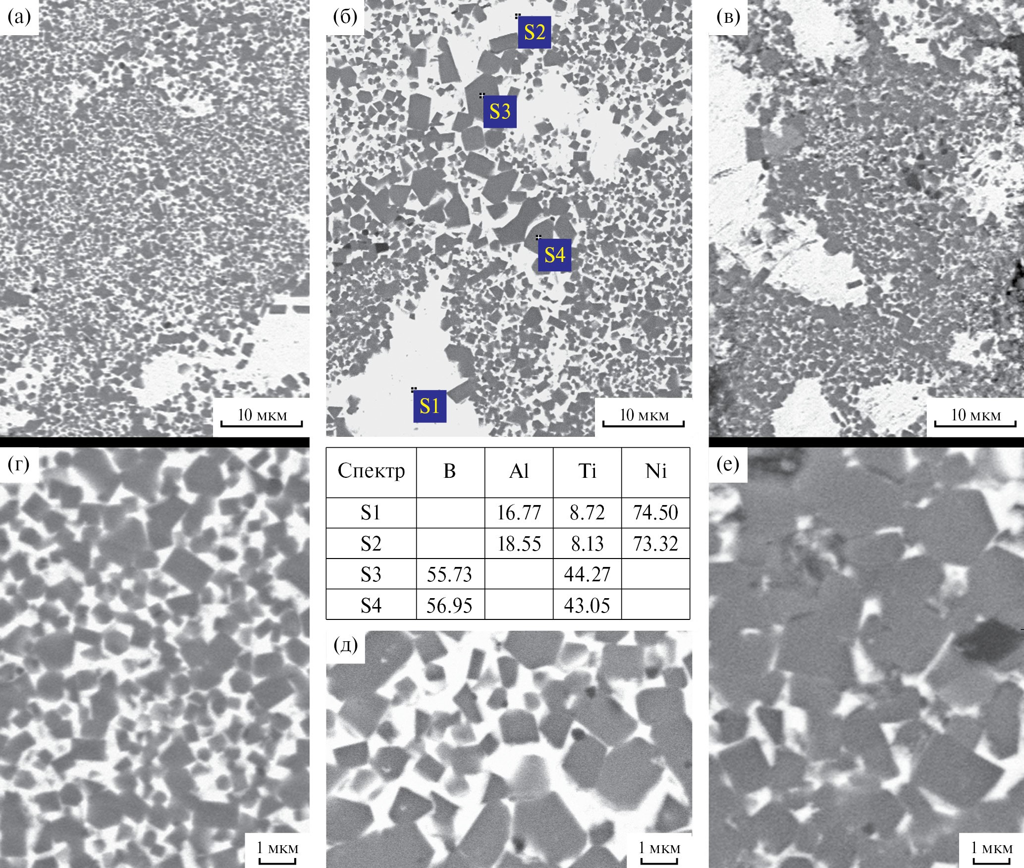 с долями элементов Ni, Al, Ti и B 57.30, 8.78, 23.37 и 10.55 мас. % в каждом составе.