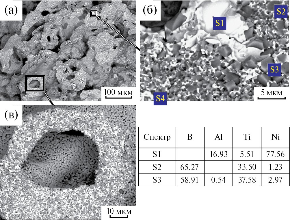 В высокотемпературных зонах распространяющейся волны горения вокруг каждой из композитных гранул возникает пористый слой диборида титана, в который происходит инфильтрация интерметаллидного расплава. В результате пористая керамическая фаза TiB2 пропитывается интерметаллидом Ni3Al по типу взаимопроникающих фаз.