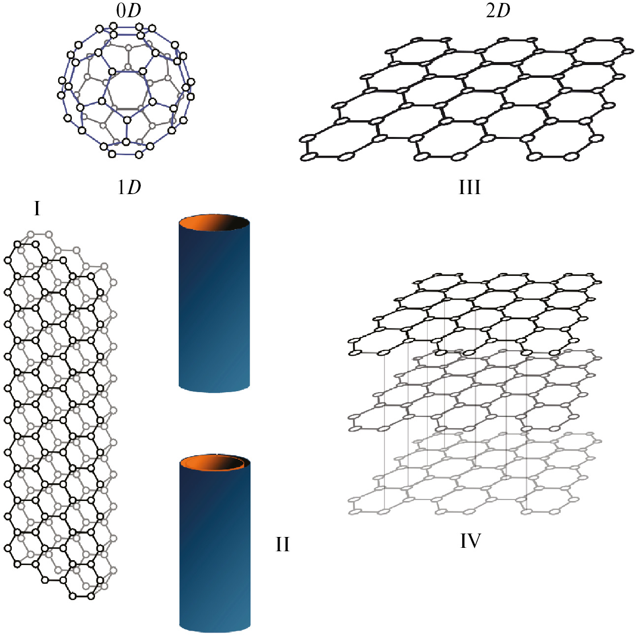 Рис. 1. Углеродные наноматериалы в соответствии с их размерностями. 0D-УНМ – фуллерены, 1D-УНМ – ОУНТ (I) и МУНТ (II), 2D-УНМ – однослойные графеновые листы (III) и структуры из нескольких слоев графена (IV).