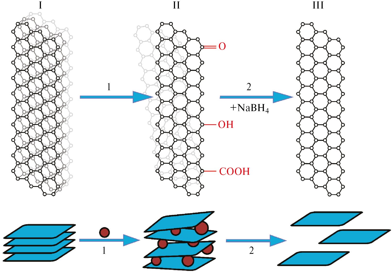 Рис. 2. Схема химического синтеза графена из графита: графит (I) в процессе окисления (1) становится оксидом графена (II), который в процессе восстановления (2) превращается в восстановленный оксид графена (III).
