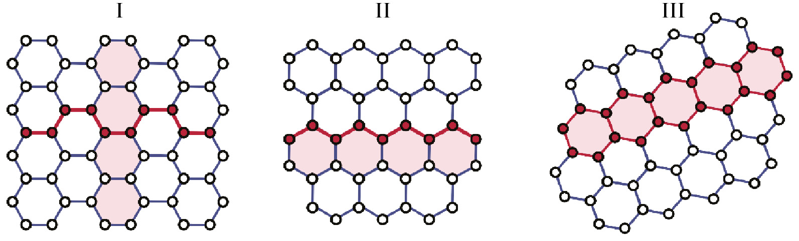 Рис. 3. Разновидности ОУНТ в зависимости от вектора хиральности: креслообразная (I), зигзагообразная (II) и хиральная (III).