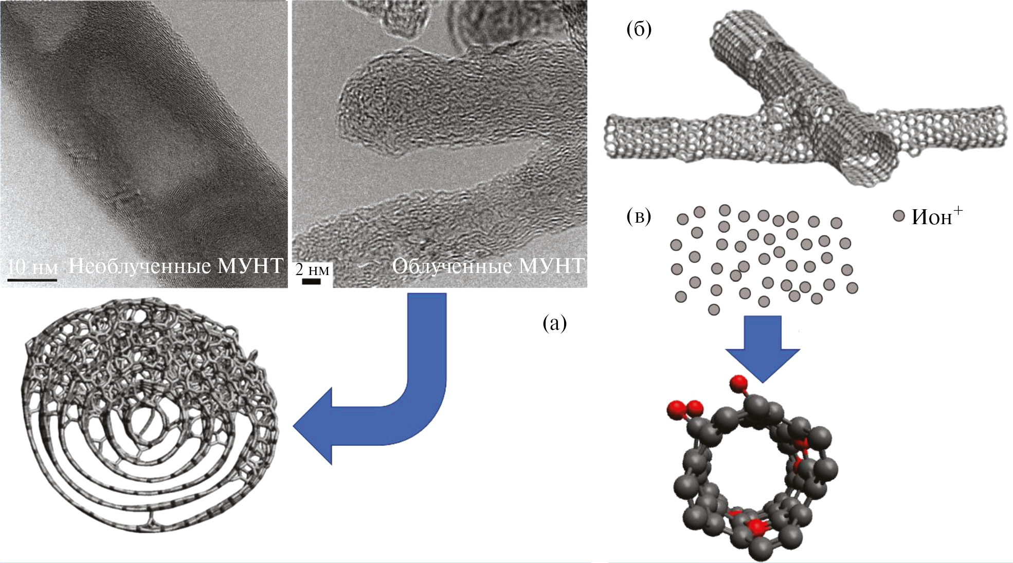 Анализ работ [55, 59–87, 95, 100–102] показывает, что наиболее изученным типом УНМ, которые подвергается ионному модифицированию, являются углеродные нанотрубки, в частности МУНТ. В процессе ионно-пучковой обработки в МУНТ чаще всего происходят следующие процессы: аморфизация и образование наностержней (рис. 5а); сварка отдельных нанотрубок с образованием жгутов и сшитых УНТ (рис. 5б); функционализация поверхности УНТ путем присоединения КСФГ различного состава и концентрации.