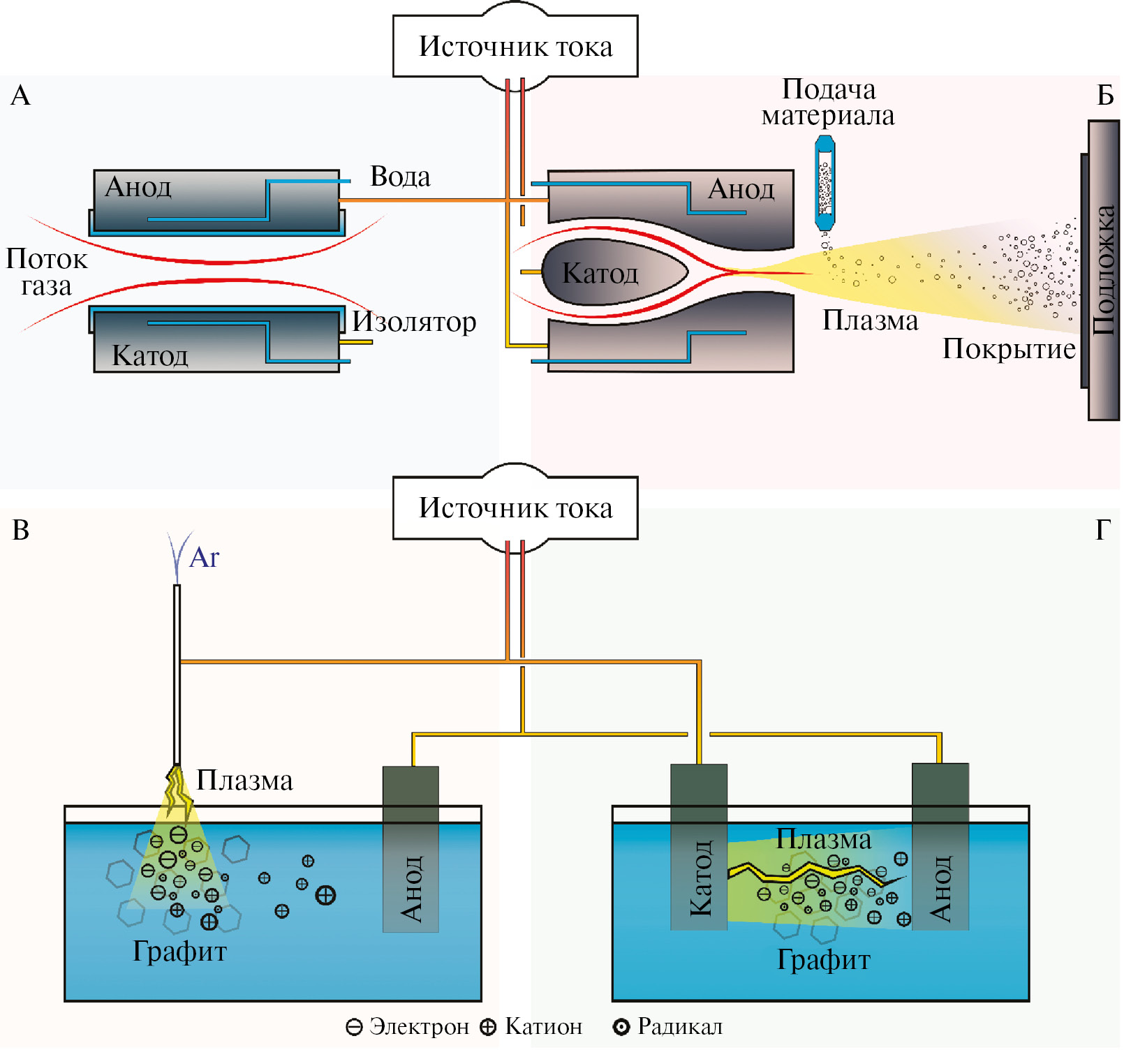 Рис. 7. Газообразный плазменный разряд: ДБР (A), плазменный факел (Б); граница раздела плазма/жидкость: атмосферный микроплазменный разряд под водой (В), плазменный разряд в воде (Г).