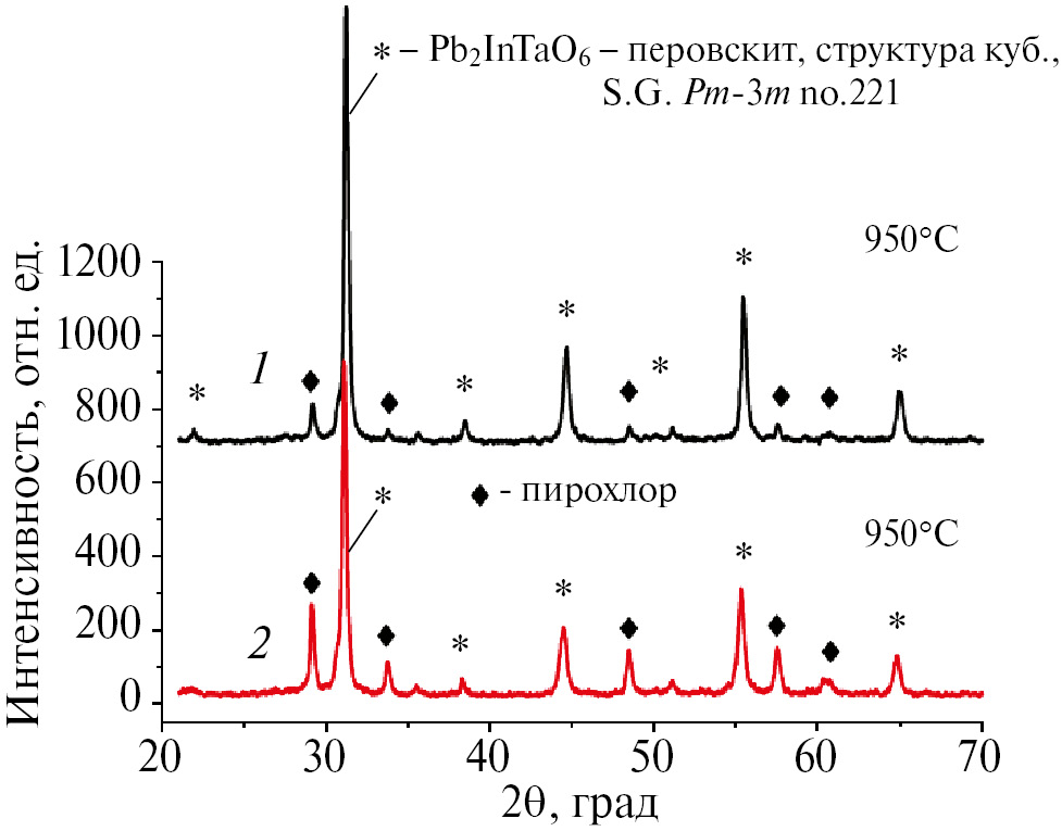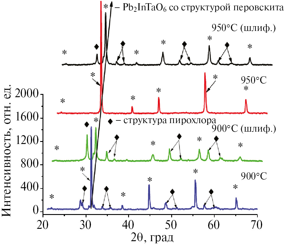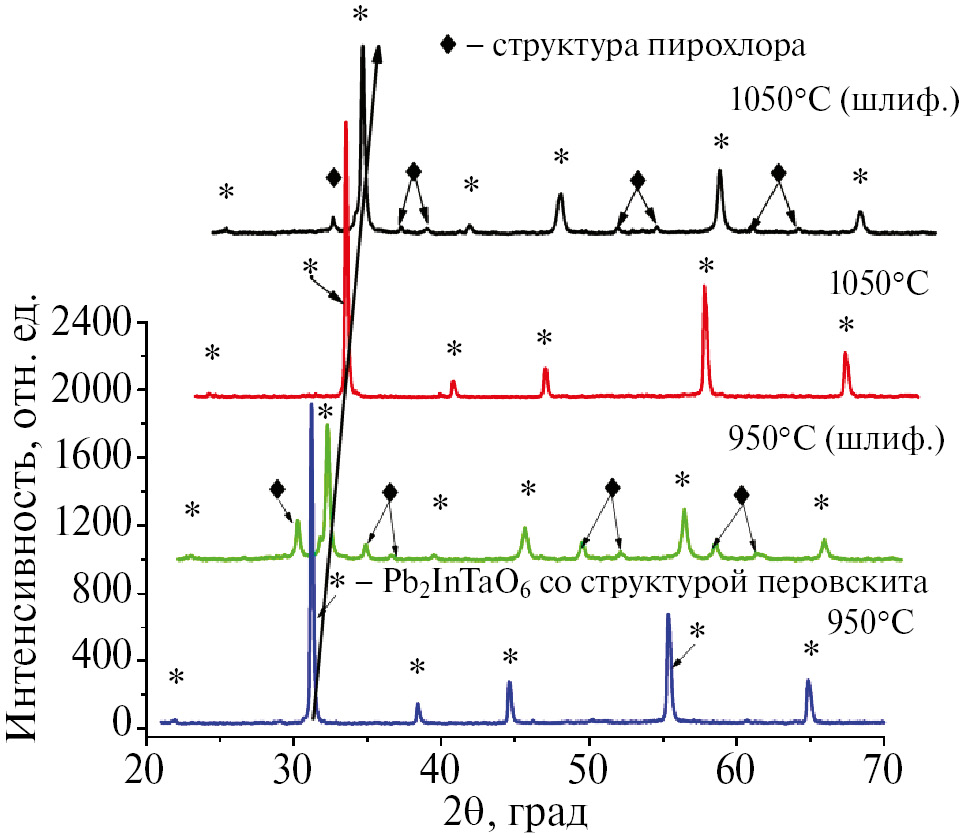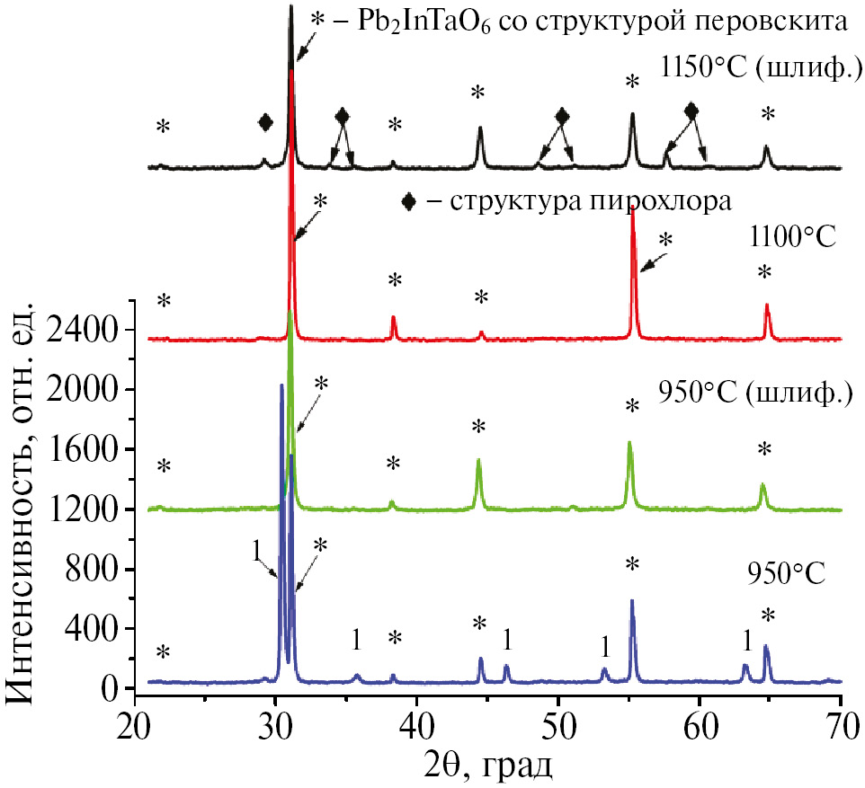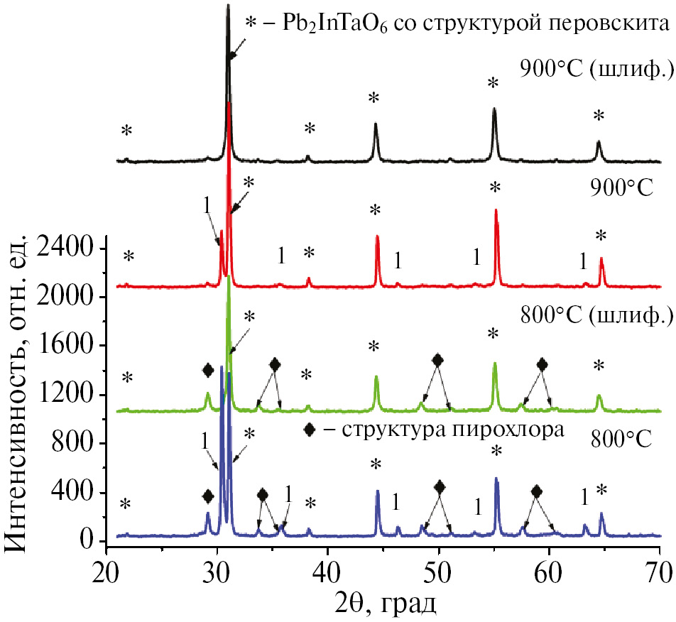 1 мас.% Li2CO3 сверх стехиометрии, время обжига 1 ч. При спекании образцов до 800°С формируется двухфазная система перовскит–пирохлор с преобладанием пирохлорной фазы. В случае обжига при 900°С, как следует из рис. 3, формируется преимущественно фаза перовскита с небольшим количеством фазы пирохлора. После шлифования образца появляется заметное количество фазы пирохлора. После обжига в интервале температур от 950 до 1050°С формируется только фаза перовскита, однако после шлифовки появляется фаза пирохлора, при этом чем при больших температурах обжигаются образцы, тем больше фазы пирохлора в них присутствует. При повышении температуры до 1100°С на нешлифованном образце появляется фаза пирохлора, а на шлифованном она преобладает. При обжиге при 1150°С наблюдается только фаза пирохлора с небольшим количеством оксида свинца Pb3O4 (фазы 2).