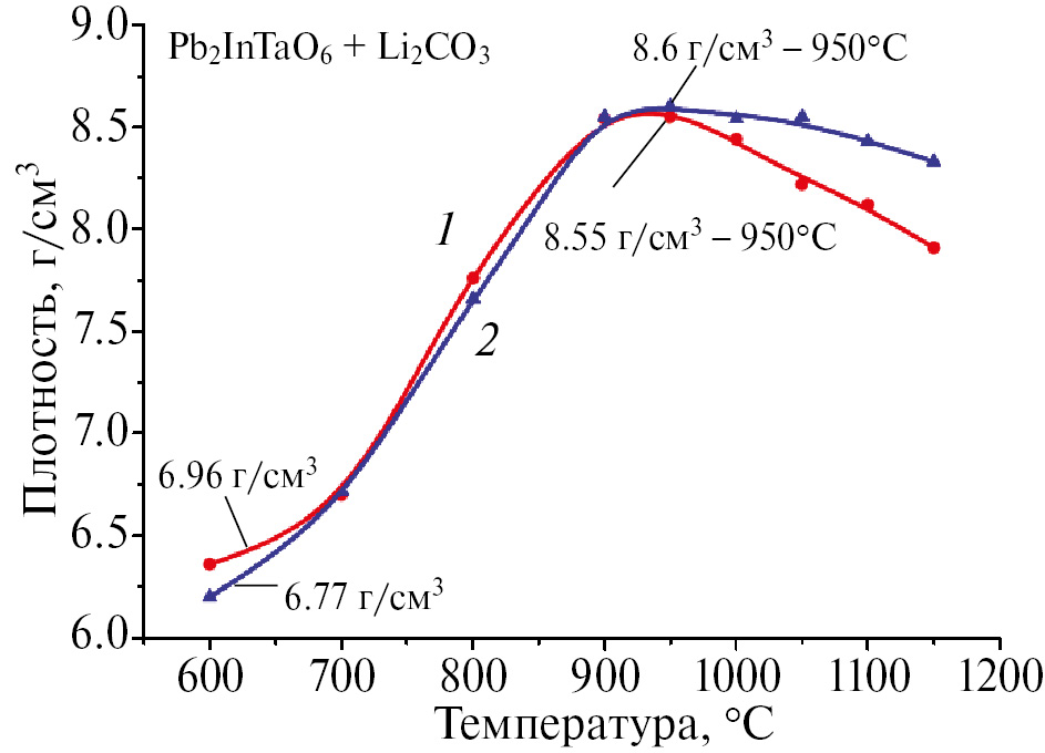Рис. 13. Зависимости плотности от температуры обжига образцов, содержащих 2 мас.% Li2CO3, после обжига в течение 1 и 2 ч.