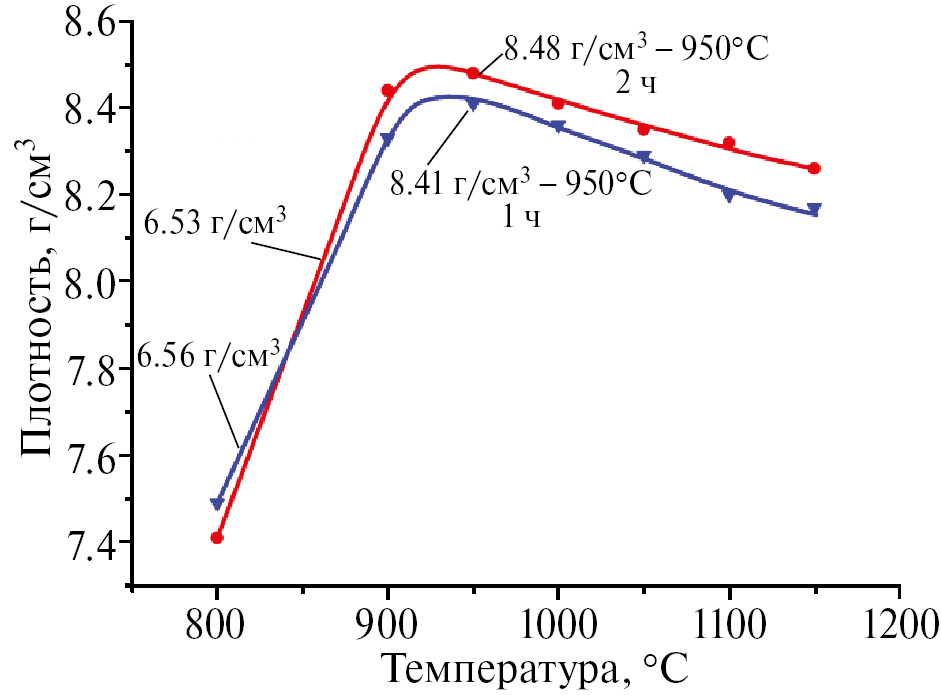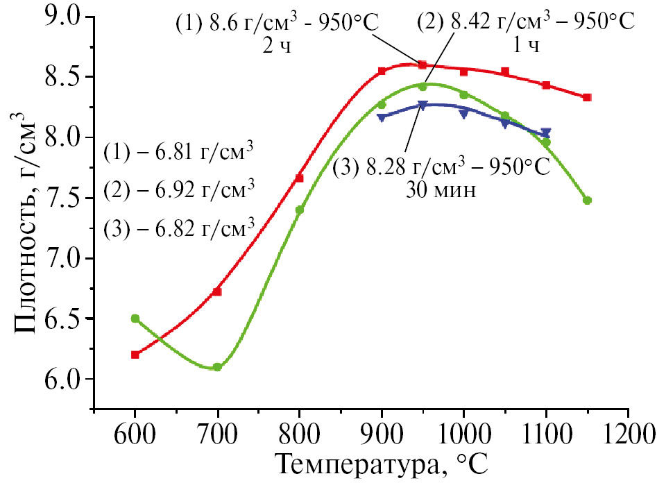Как следует из данных, представленных на рис. 5, наиболее плотные образцы получены при спекании в течение 2 ч.