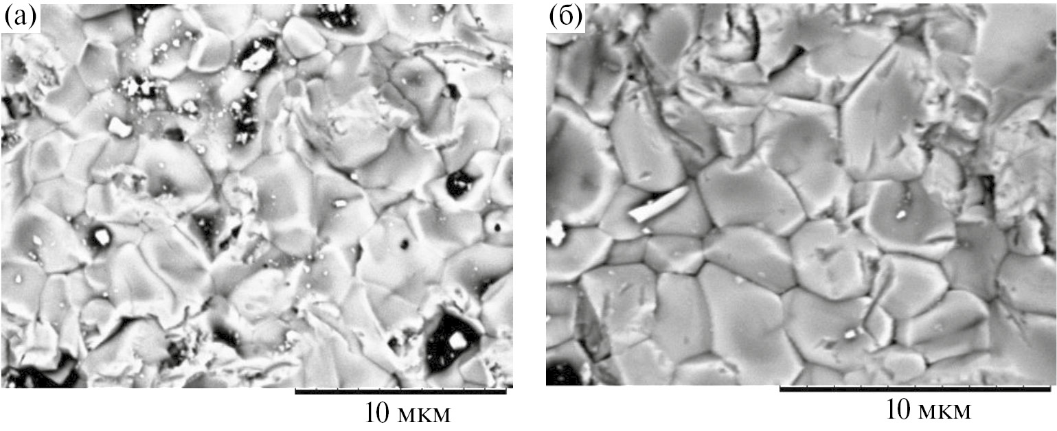 Рис. 6. Микрофотографии образцов после обжига при 950 (a) и 1000°С (б) в течение 30 мин, содержание Li2CO3 – 1 мас.%.