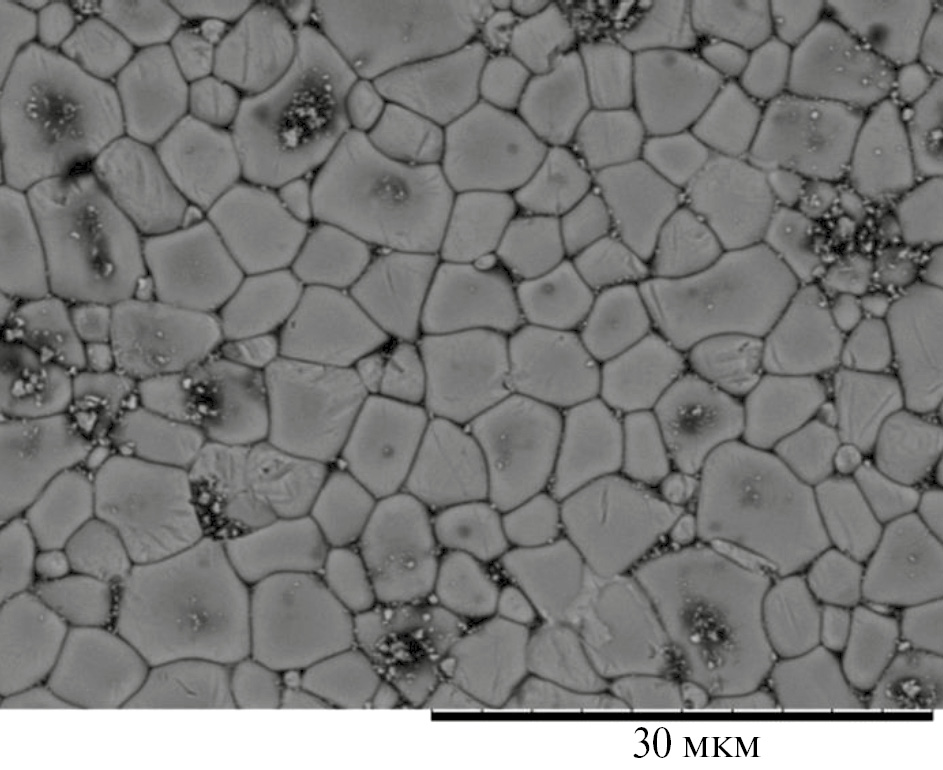 Шлифованные образцы после обжига при 1150°С также двухфазны, при этом содержание фазы перовскита 73%, остальное – фаза пирохлора. Беспримесная фаза перовскита наблюдается у шлифованных образцов в интервале температур от 900 до 1100°С. На рис. 8 показана поверхность образца после обжига при 950°С в течение 2 ч. Светлые кристаллы принадлежат тетрагональной фазе перовскита.