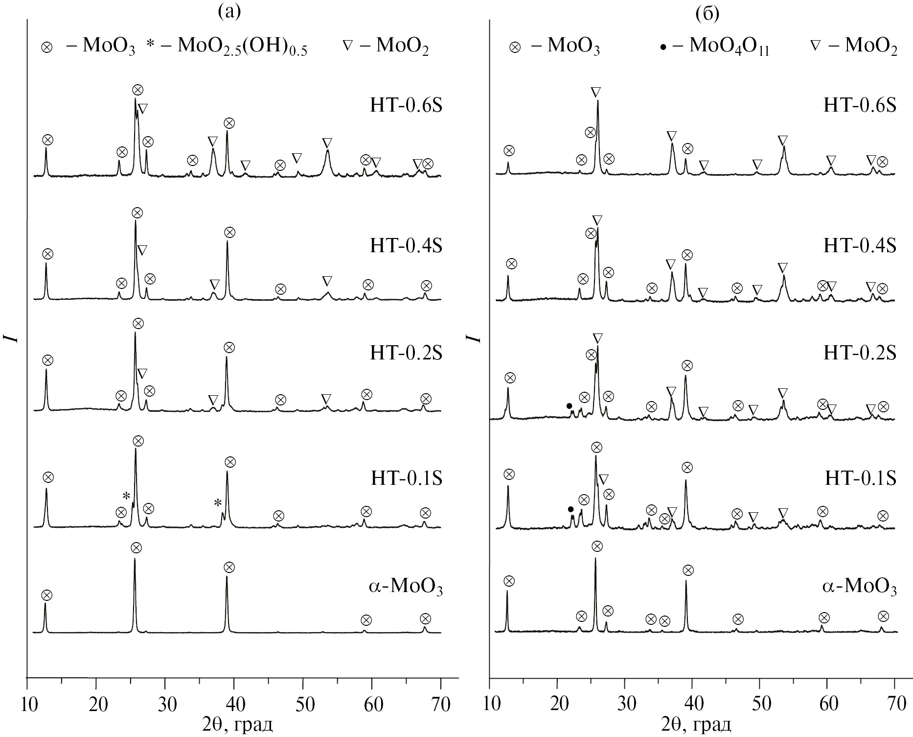 Дифрактограммы высушенных и прокаленных одномерных структур до и после обработки водным раствором сахарозы показаны на рис. 2. До обработки высушенного порошка водным раствором сахарозы (рис. 2а) рефлексы соответствуют однофазному продукту – α-МоО3 (JCPDS, № 5-508). После обработки высушенных структур водным раствором сахарозы на дифрактограммах появляются дополнительные низкоинтенсивные рефлексы этого же соединения и новые, соответствующие моноклинной фазе МоО2 (JCPDS, № 73-1807). С увеличением концентрации сахарозы в растворе интенсивность рефлексов, соответствующих МоО2, возрастает. После прокаливания этих же образцов в вакууме (рис. 2б) на дифрактограмме необработанного порошка наблюдаются все рефлексы, соответствующие α-МоО3, включая низкоинтенсивные, которые не регистрировались до прокаливания (см. рис. 2а). После обработки порошка водным раствором сахарозы на дифрактограммах прокаленных образцов также регистрируются рефлексы, соответствующие α-МоО3 (JCPDS, № 5-508) и моноклинной фазе МоО2 (JCPDS карта, № 73-1807). Однако интенсивность рефлексов МоО2 заметно увеличивается с повышением концентрации сахарозы в водном растворе.