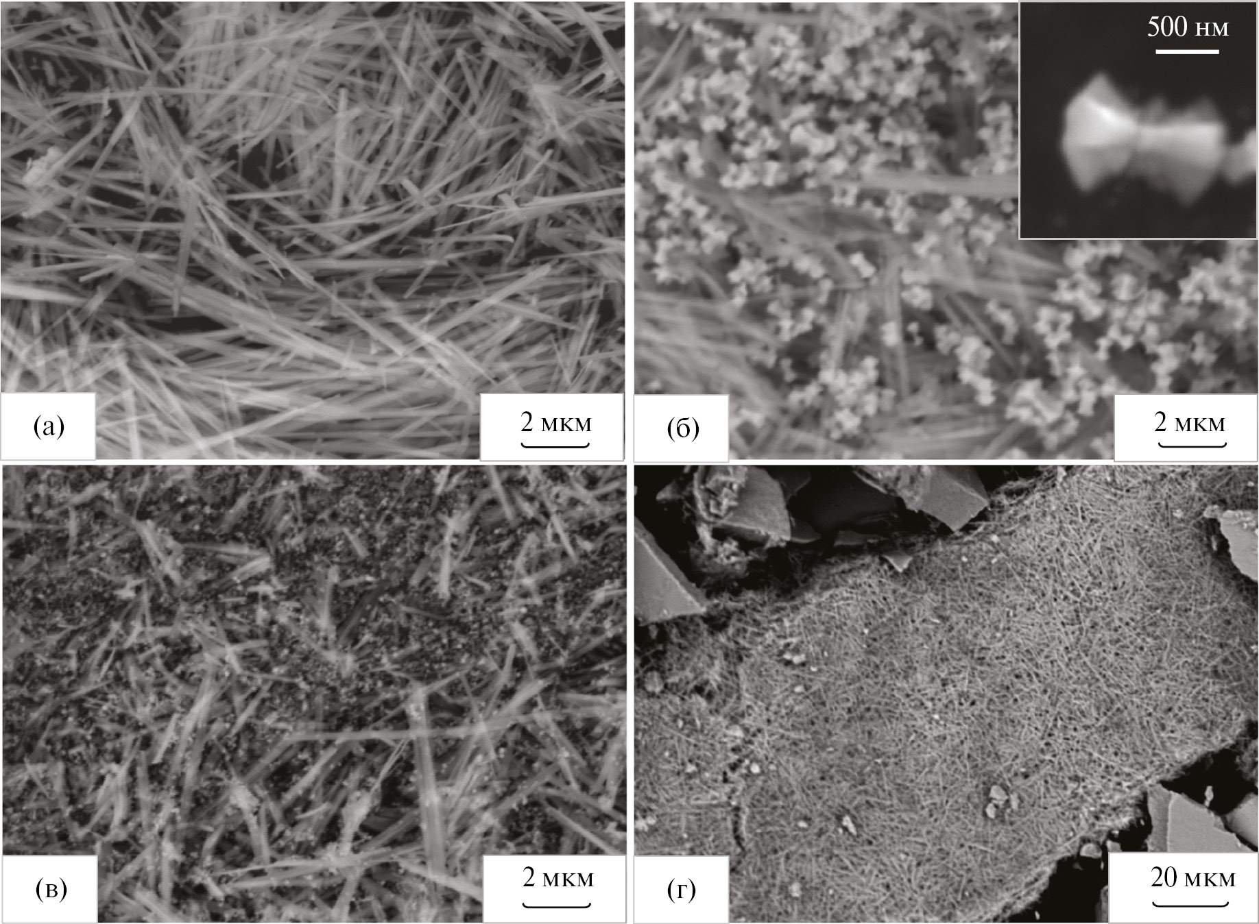 Типичные СЭМ-изображения высушенных порошков после гидротермальной обработки в водном растворе сахарозы показаны на рис. 3. Можно заметить, что морфология одномерных структур практически не меняется после их обработки в водном растворе с 0.1 мас.% сахарозы (рис. 3а). Обработка структур в водном растворе с 0.2 мас.% сахарозы приводит к образованию новых гантелеподобных структур (рис. 3б). Длина таких структур достигает ~1.5 мкм при ширине, не превышающей 1 мкм (рис. 3б, вставка). На СЭМ-снимке порошка, обработанного водным раствором с 0.4 мас.% сахарозы (рис. 3в), наблюдаются фрагменты одномерных структур и отдельные частицы, имеющие размер в несколько десятков нанометров. После обработки порошка водным раствором с 0.6 мас.% сахарозы на СЭМ-снимках можно увидеть лишь крупные агрегаты, в том числе состоящие и из плотно объединенных одномерных структур, как показано на рис. 3г.