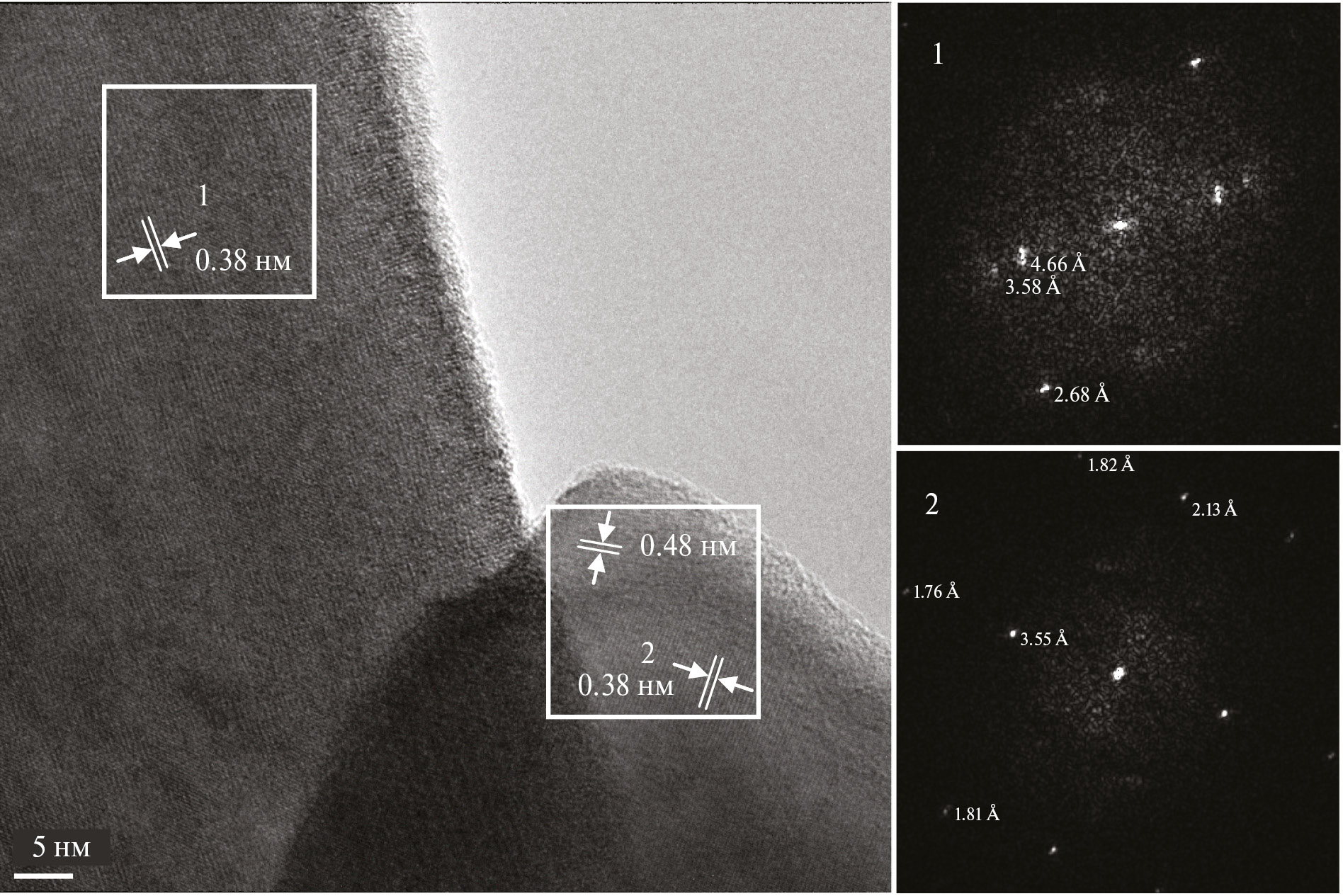 Рис. 5. ПЭМ ВР-изображение прокаленного в вакууме продукта, обработанного водным раствором с 0.2 мас.% сахарозы, и Фурье-дифрактограммы, рассчитанные с выделенных областей этого образца.