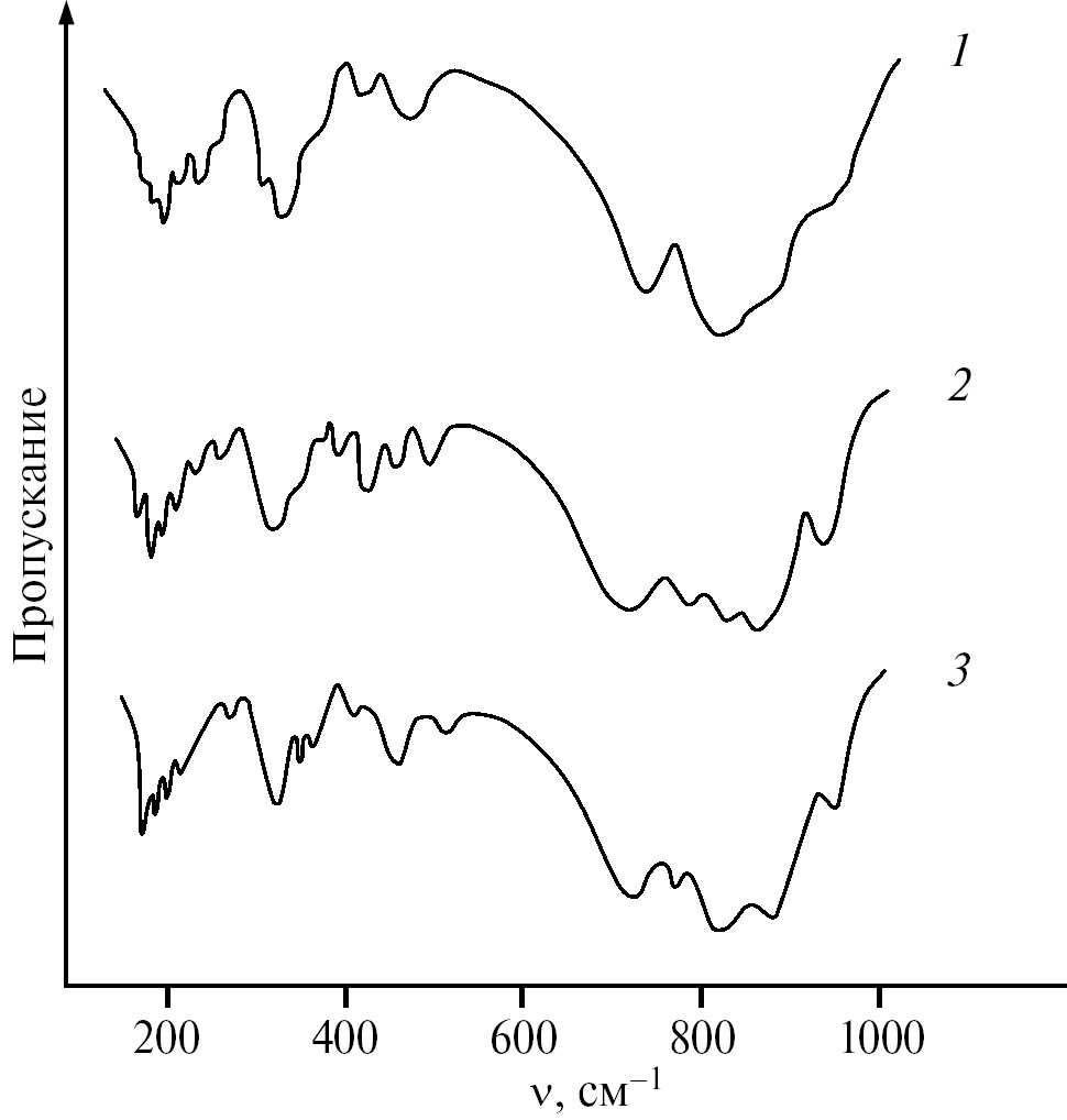 Рис. 2. ИК-спектры α-KSm(MoO4)2 (1), KSrSm(MoO4)3 (2), KSrGd(MoO4)3 (3).