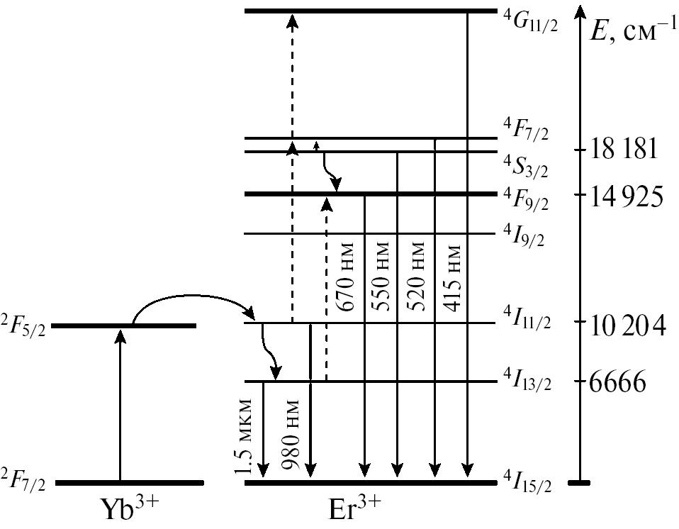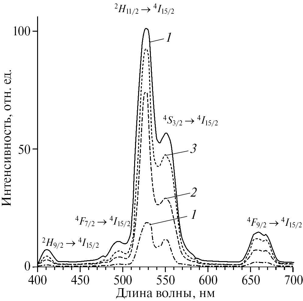 После двухстадийного последовательного возбуждения ионов Er3+ до уровня 4F7/2 в результате безызлучательных релаксаций происходит заселение возбужденных уровней 2Н11/2, 4S3/2, 4F9/2, 4I9/2, что приводит к ап-конверсионной люминесценции в области 400–700 нм [7-13].