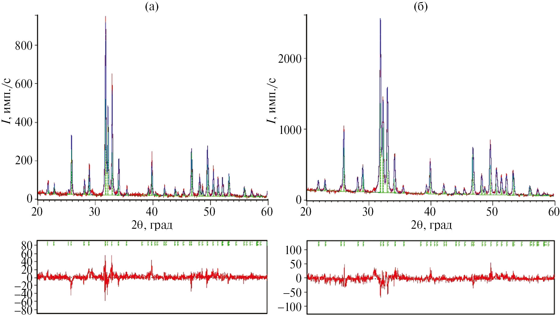 Рис. 2. Рентгеновские дифрактограммы синтезированных образцов ГА (а) и ZnГА (б) и аппроксимация методом Ритвельда: экспериментальные данные представлены красной сплошной линией, расчетный профиль – синяя сплошная линия, кривая разницы (экспериментальная минус рассчитанная) – сплошная красная линия .