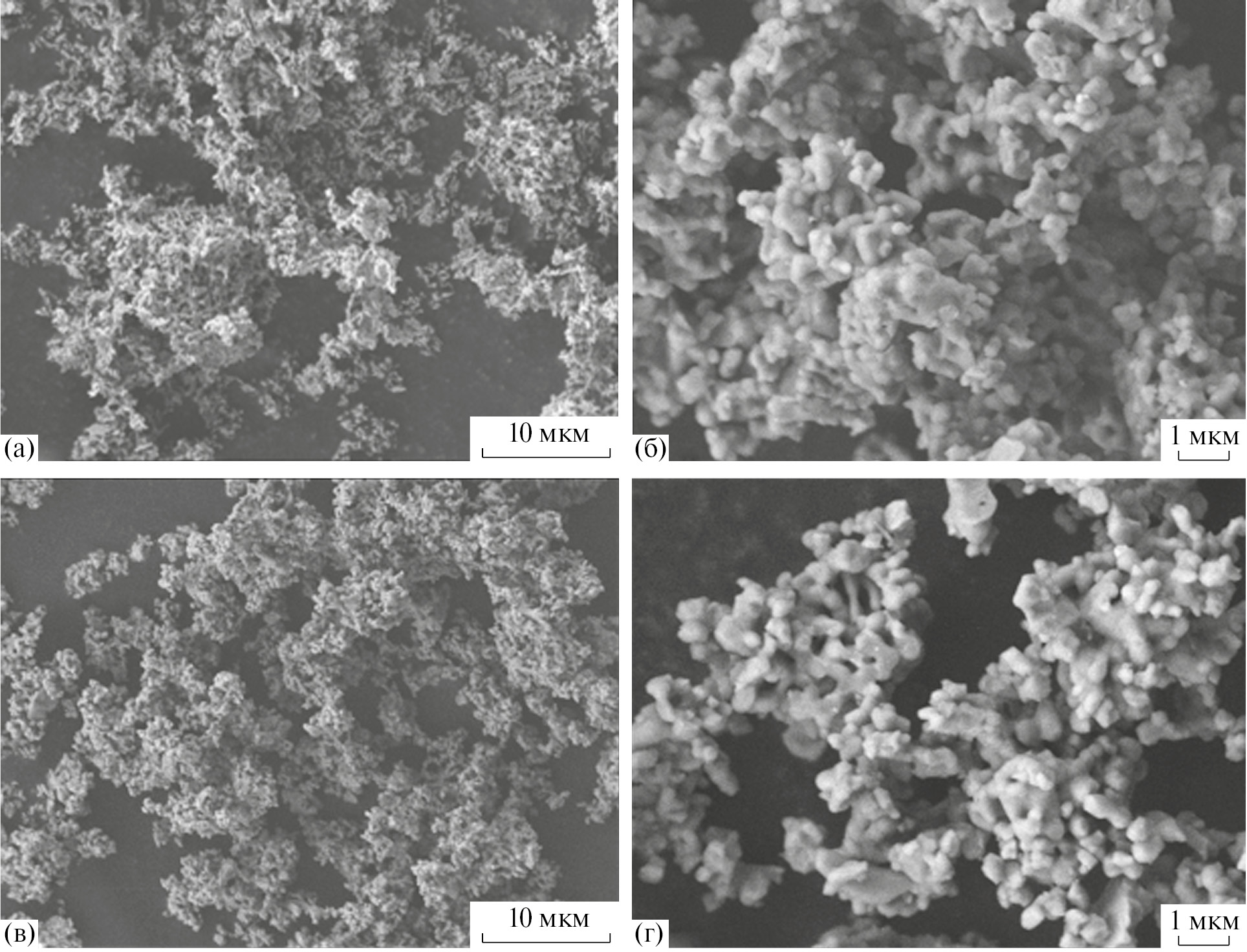 Рис. 5. Микрофотографии образцов ГА (а, б) и ZnГА (в, г) при разных увеличениях.