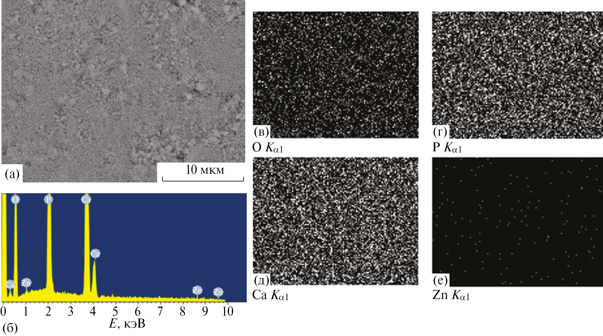 На рис. 6 представлены область сканирования 30 × 20 мкм (а), ЭДА-спектр образца ZnГА (б), карты распределения элементов в образце ZnГА (в). Аналогичное исследование выполнено для ГА. Результаты энергодисперсионного микроанализа ZnГА приведены в табл. 3. По результатам ЭДА, для исследуемого образца ГА характерно наличие следующих элементов: Ca, P и O. В образце ZnГА присутствует сигнал Zn, который по отношению к пикам других элементов имеет низкую интенсивность, поскольку степень замещения кальция на цинк в ходе синтеза составляет порядка 1%. В результате анализа были рассчитаны соотношения Ca/P и (Ca+Zn)/P, равные 1.68 и 1.66 соответственно. Полученные кальций-фосфатные соотношения близки к значению в стехиометрическом ГА (1.67) [46, 49, 50].