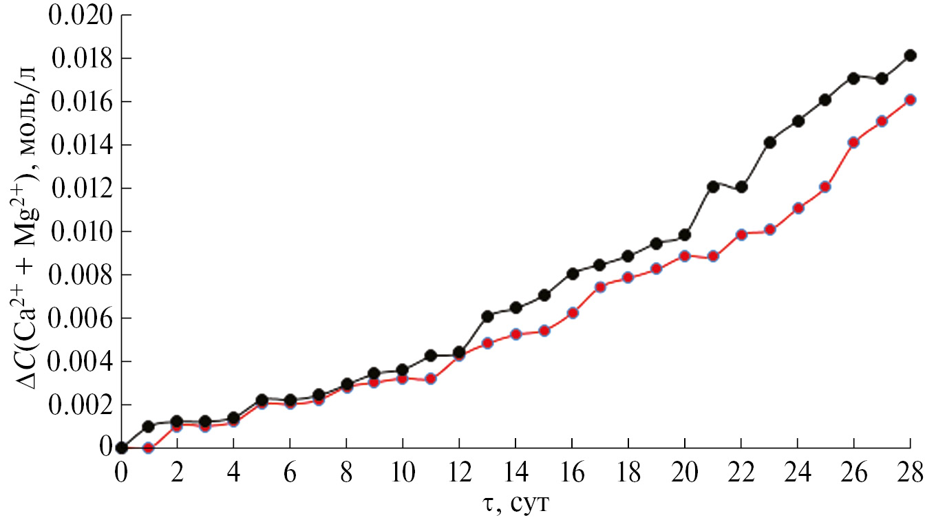 Способность вещества связываться с костями нередко оценивается при изучении способности апатита образовываться на поверхности материала в моделируемом растворе SBF, содержащем концентрацию ионов, почти равную концентрации ионов плазмы крови человека. Скорость формирования КФС на поверхности таблеток ZnГА, ГА оценена по уменьшению суммарной концентрации ионов кальция и магния (ΔС(Ca2+ + Mg2+), моль/л) в растворе SBF. На основании измеренной суммарной концентрации ионов Са2+ и Мg2+ в растворе построены кинетические кривые (ΔС(Са2+ + Мg2+), моль/л – τ, сут) их накопления на поверхностях подложек из раствора SBF (рис. 7). В ежедневно отбираемых пробах комплексонометрическим титрованием определяли суммарное содержание ионов Ca2+ и Mg2+ в связи с близкими значениями констант устойчивости комплексов кальция и магния с ЭДТА.