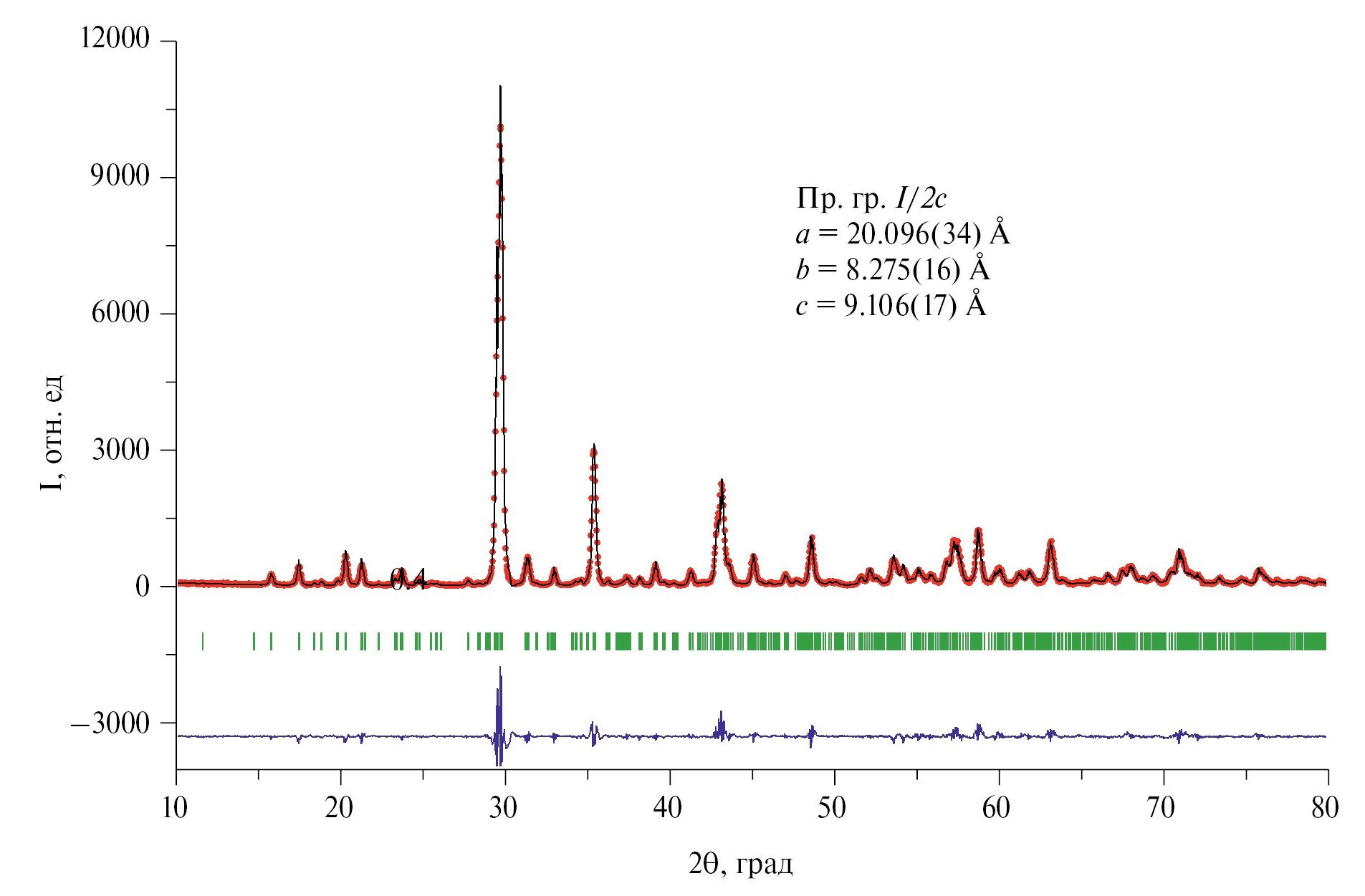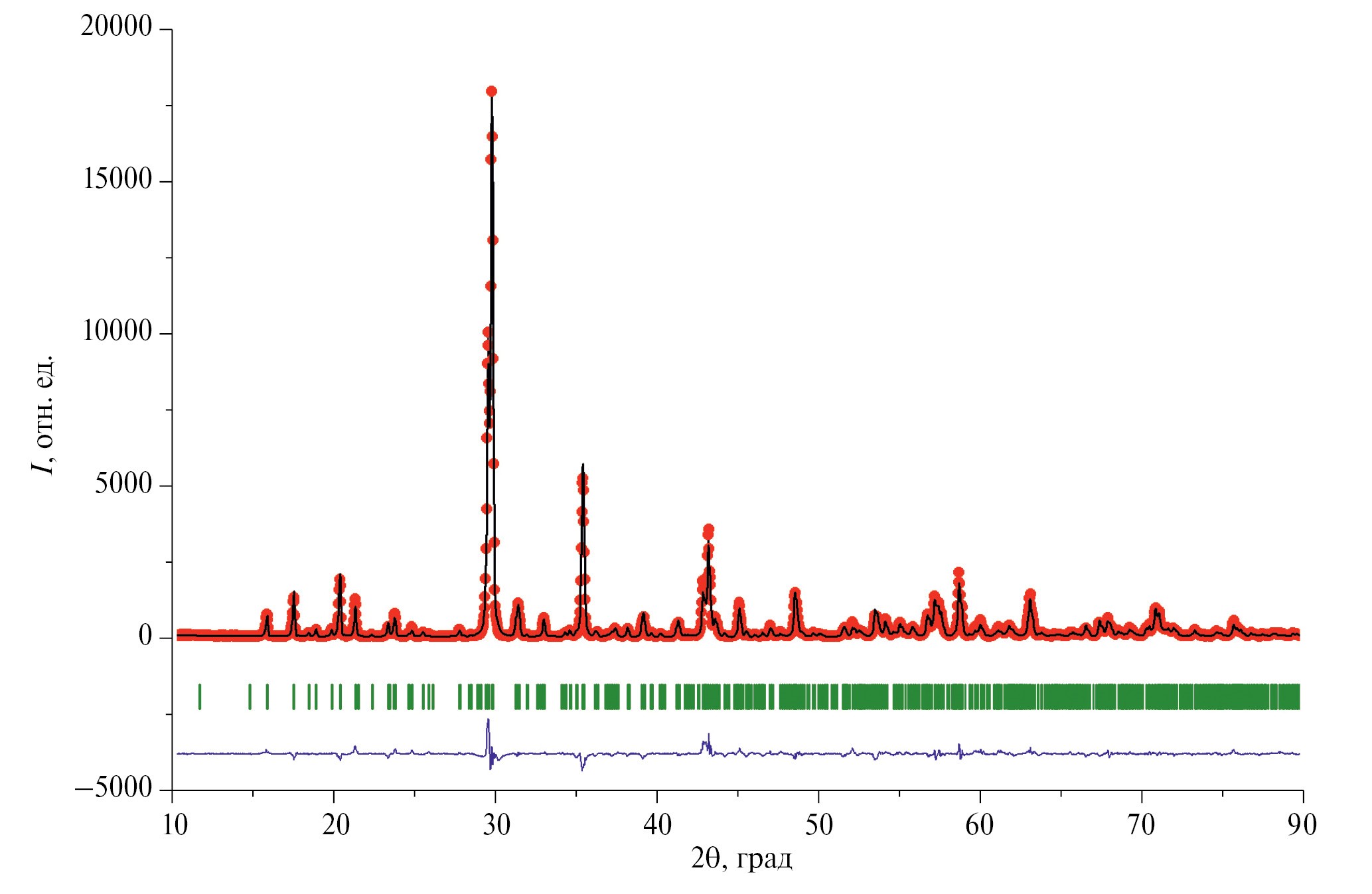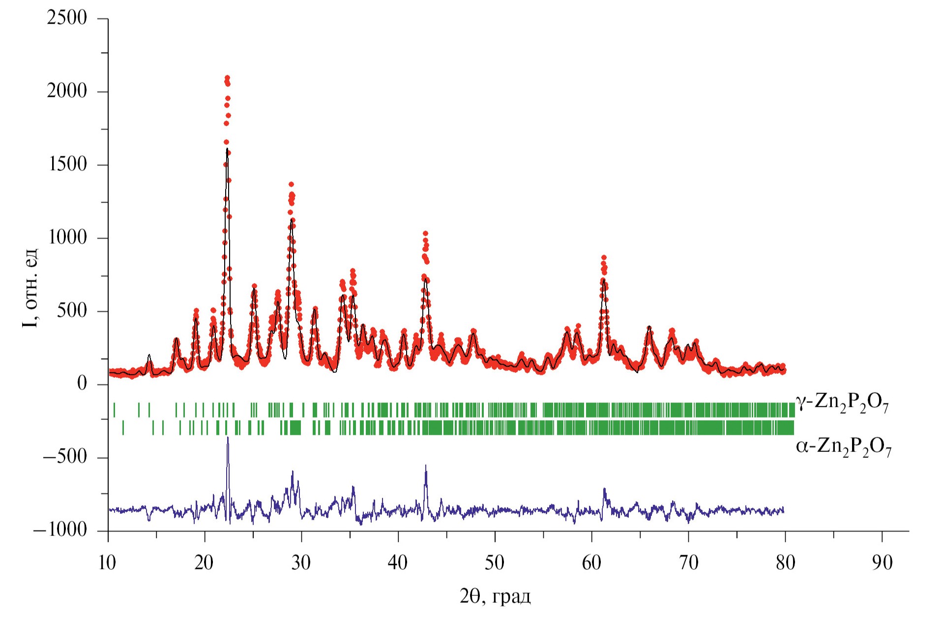 Рис. 1. Экспериментальная (точки) и расчетная (линия) рентгенограммы синтезированного Zn₂P₂O₇ (разность между экспериментом и расчетом – синяя линия, штрихи – угловые положения рефлексов фазы α-Zn₂P₂O₇, структурная модель α-Zn₂P₂O₇ взята из статьи [15]).