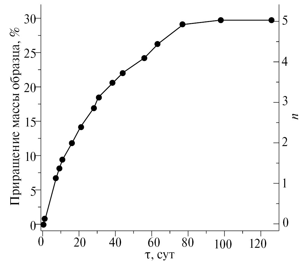 Кривая поглощения паров воды порошком α-Zn₂P₂O₇ приведена на рис. 3. Видно, что после 80 сут выдержки во влажной атмосфере масса образца увеличивается на 30% и становится практически постоянной, а его состав отвечает формуле Zn₂P₂O₇ 5H₂O.