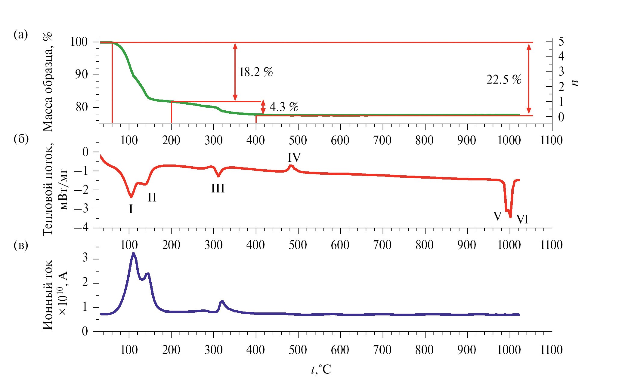 Рис. 5. Результаты СТА для образца Zn₂P₂O₇∙5H₂O: а – кривая ТГ, б – кривая ДСК, в – кривая ионного тока H₂O (m = 18).