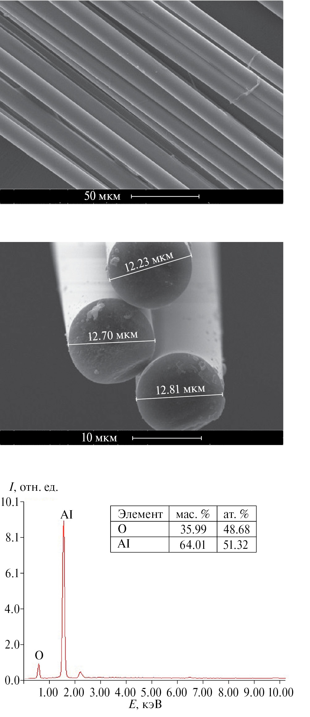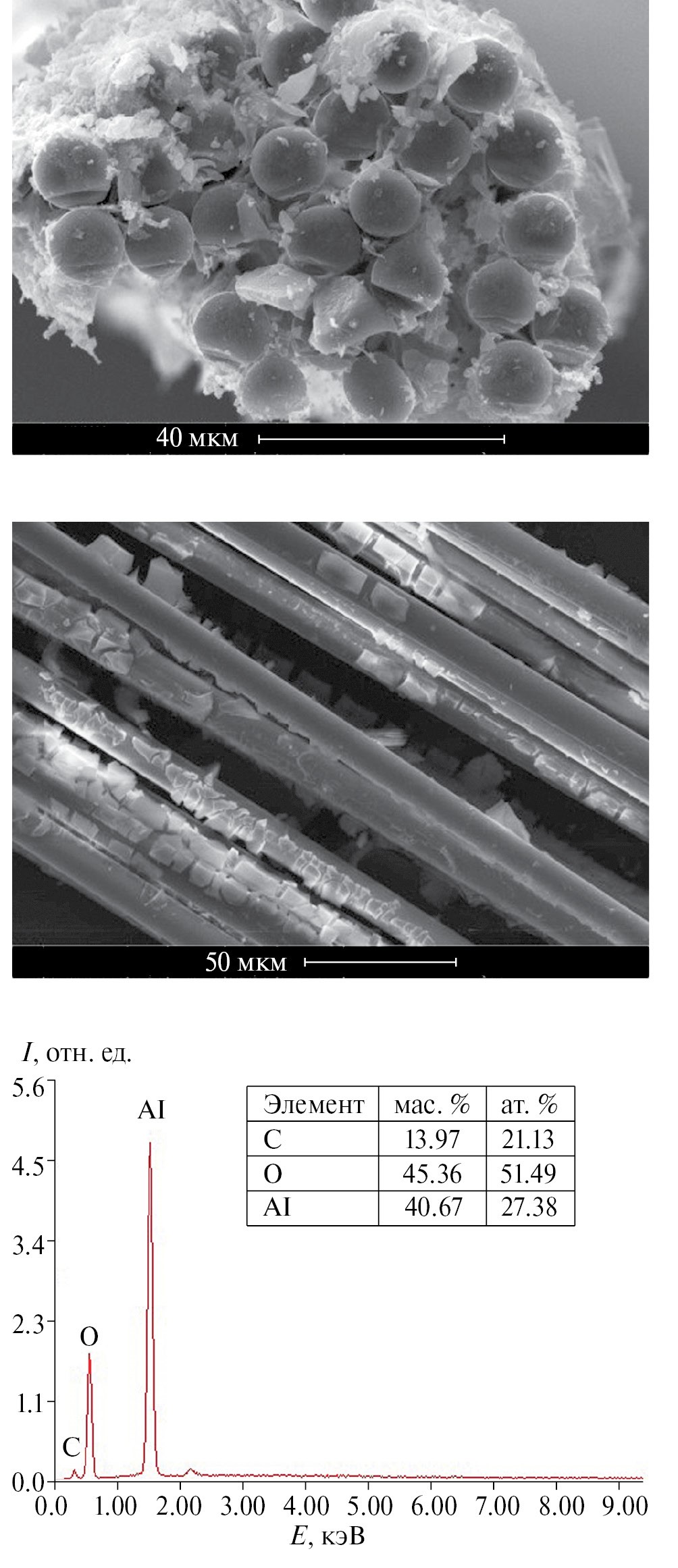 Согласно результатам рентгеновского элементного микроанализа (рис. 6), основная фаза отдельных филаментов исходного материала состоит из оксида алюминия. Диаметр исходных алюмооксидных волокон в материале составляет ~12 мкм. В процессе пиролиза происходит полная деструкция аппрета.