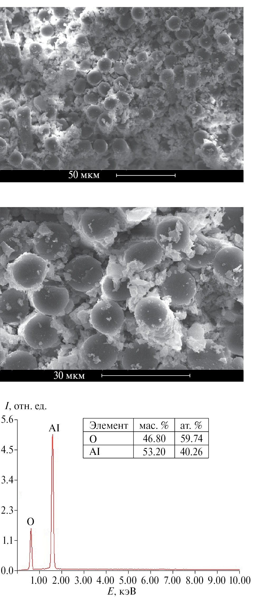 Рис. 1. СЭМ-изображения и данные рентгеновского элементного микроанализа органоалюмоксана.