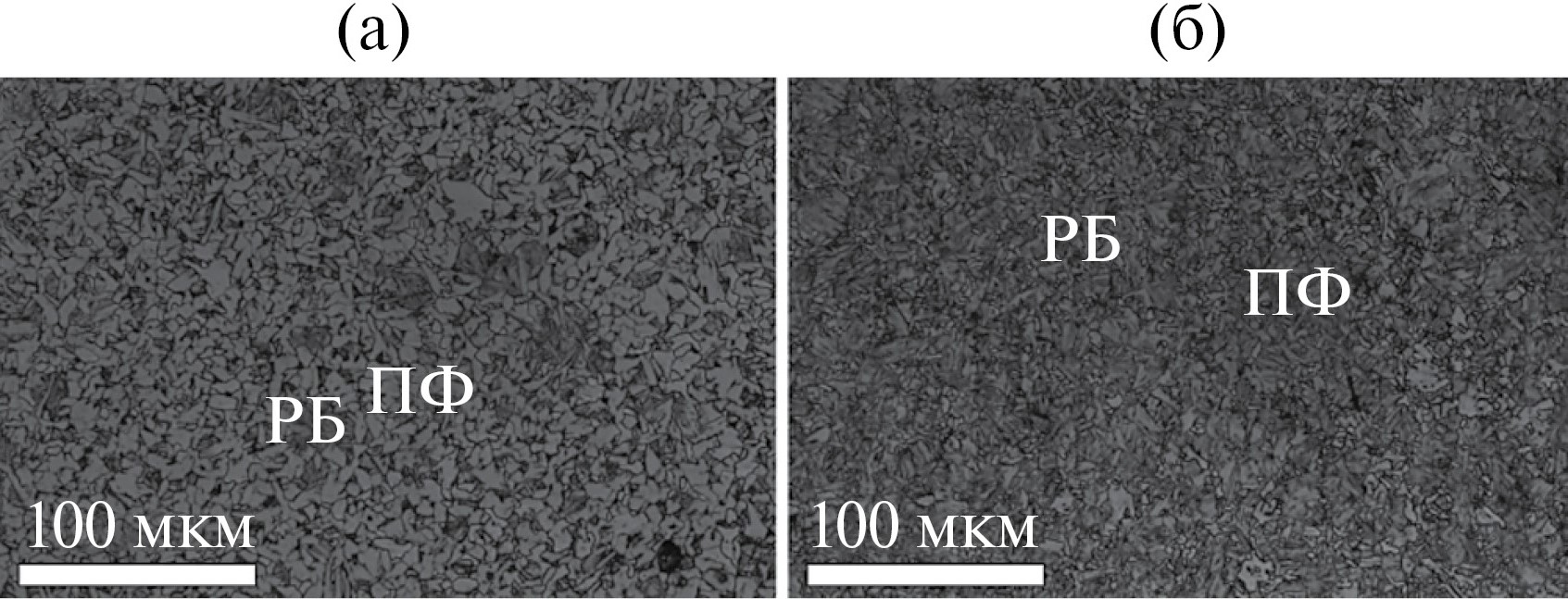 Рис. 1. Микроструктура стали 1(а), 2(б) (РБ – реечный бенит, ПФ – полигональный феррит).