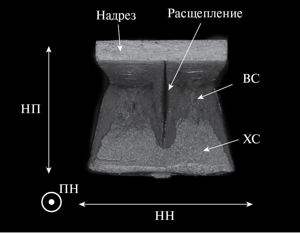 Рис. 2. Характерный излом с расщеплением стали 1 (ВС и ХС – вязкая и хрупкая составляющие).