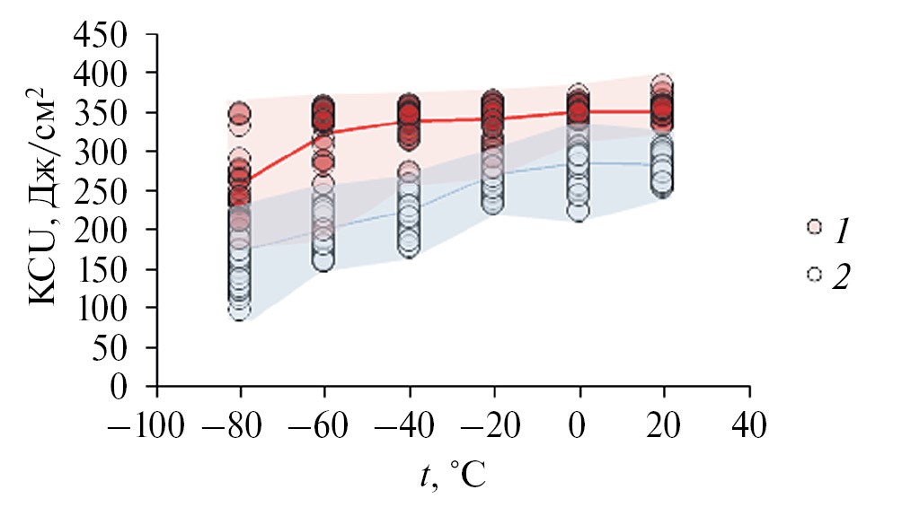 Рис. 3. Температурные зависимости ударной вязкости, полученные по результатам множественных испытаний на ударный изгиб, для сталей 1 и 2.