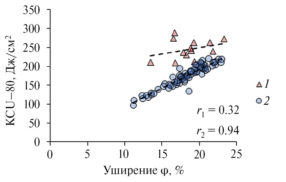 Рис. 4. Количественная оценка соотношения уширения ϕ разрушенных образцов и ударной вязкости KCU⁻⁸˚для сталей 1 и 2.