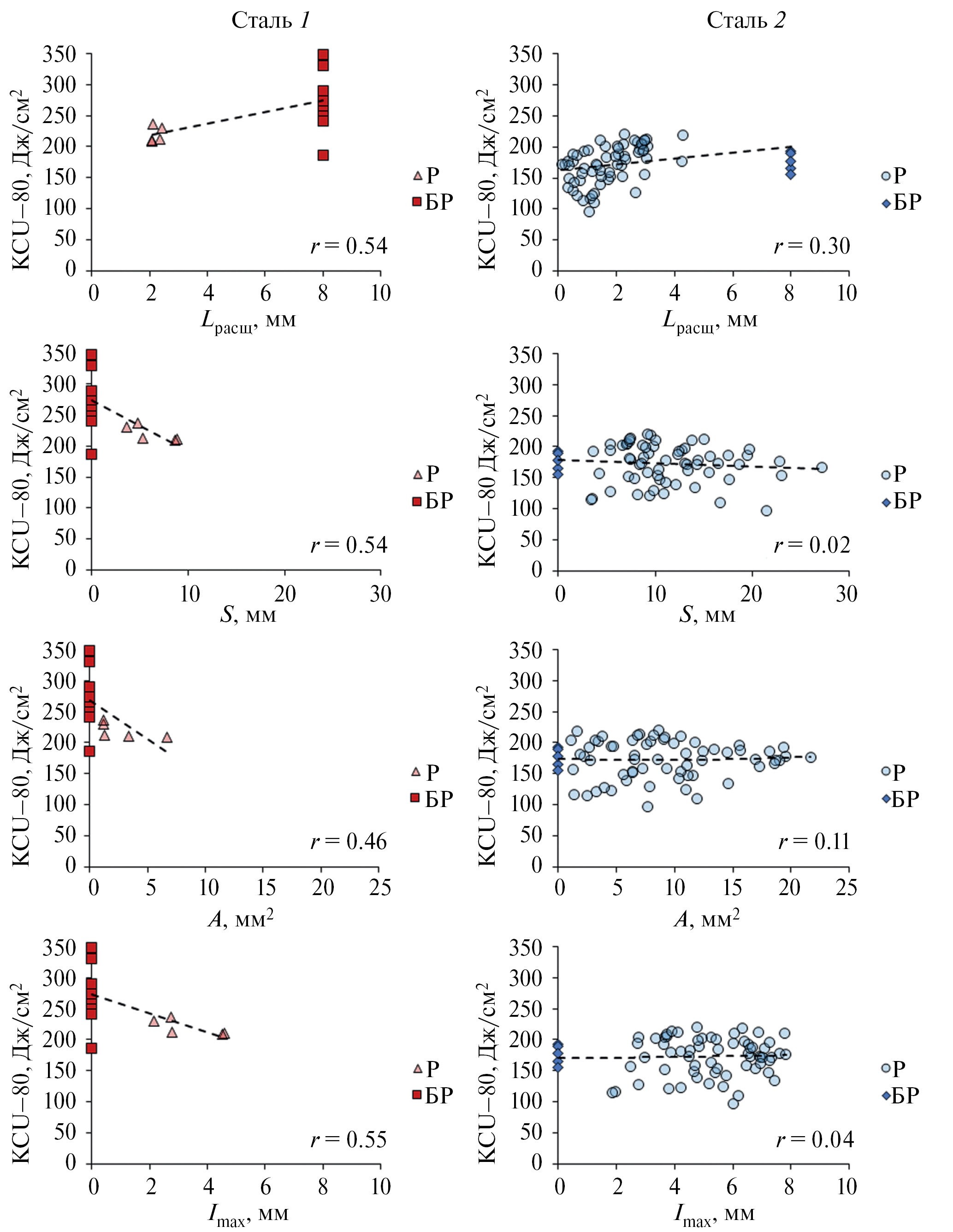 Увеличение уширения образцов приводит к росту значений ударной вязкости для обеих сталей. При этом диапазоны значений уширения для сталей преимущественно совпадают, хотя для стали 1 наблюдается более высокий уровень значений ударной вязкости.