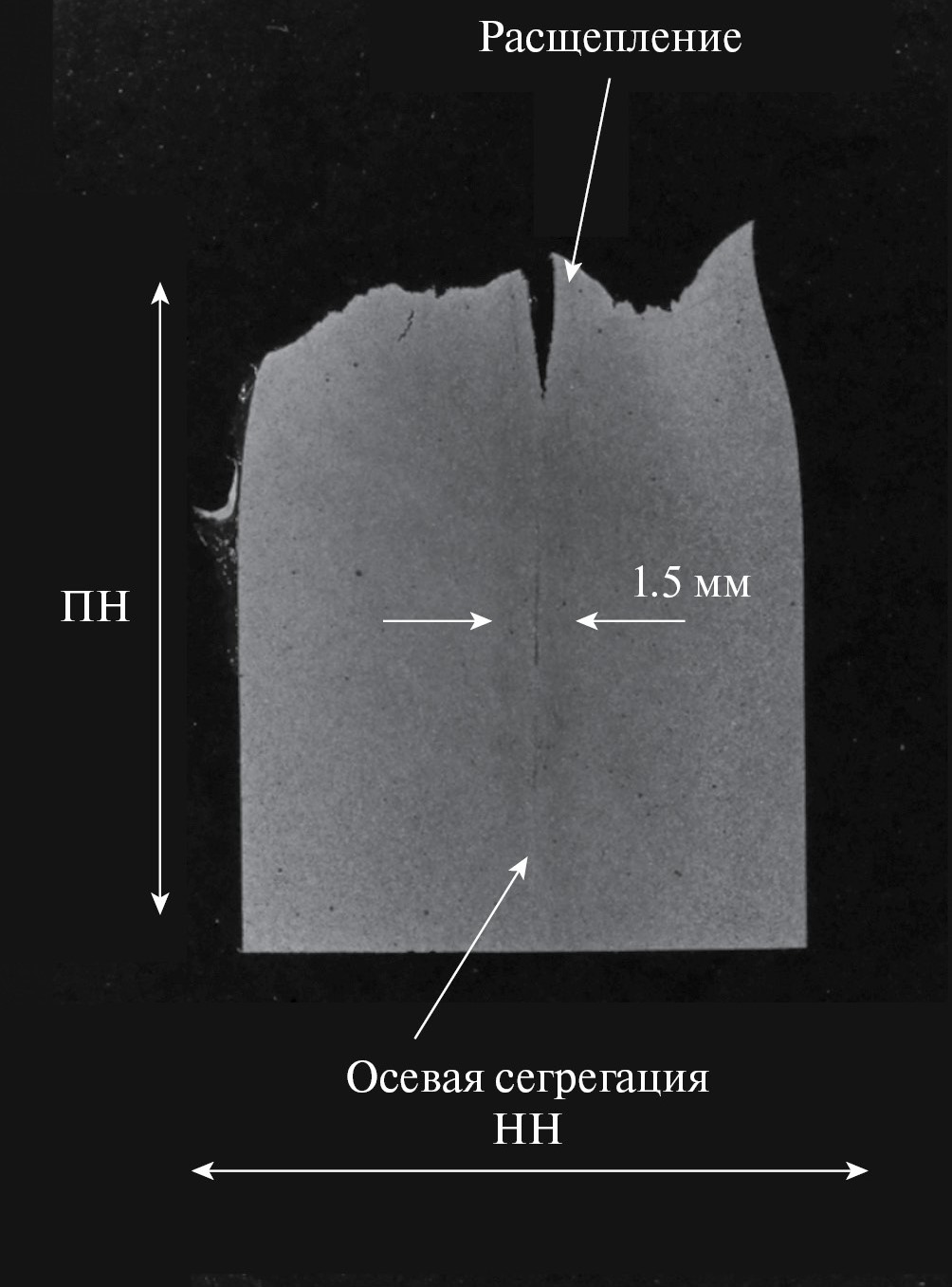 На макрофотографиях после травления ниталом область осевой сегрегации выделяется по аномальной микроструктуре, в которой наблюдаются бейнитные полосы и повышенная концентрация неметаллических включений. Ширина такой области по толщине проката составляет 1.2–1.5 мм. При испытаниях на ударный изгиб расщепления располагаются в середине области осевой сегрегации в месте действия максимальных нормальных напряжений.