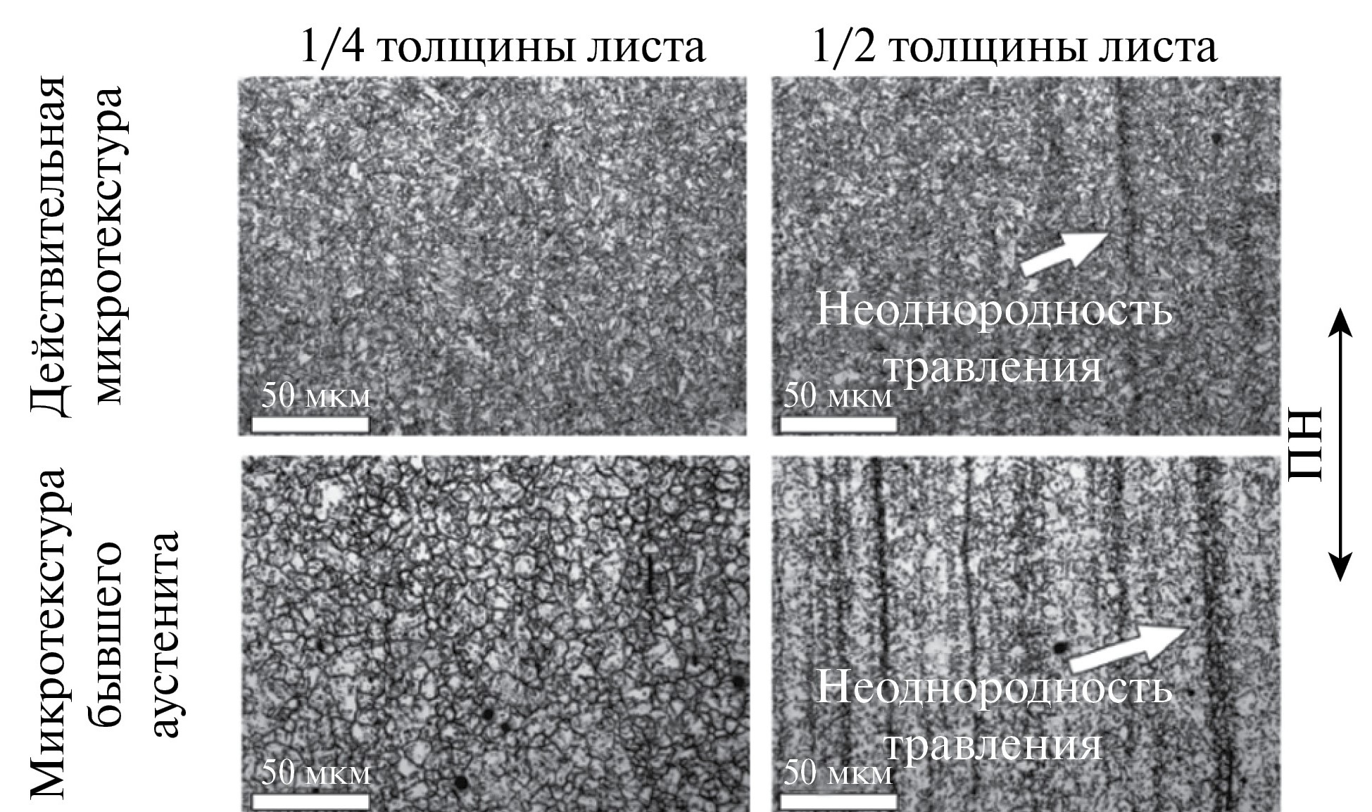 В отличие от однородной ферритно-бейнитной (Ф-Б) микроструктуры на расстоянии 1/4 по толщине проката, микроструктура в сердцевине проката проявляет неоднородности травления. Более того, травление в подогретом водном растворе пикриновой кислоты с ПАВ выявило ту же неоднородность травления. Такого рода неоднородности выстроены вдоль НП стального листа. При этом полигональные зерна бывшего аустенита пересекают отмеченные области неравномерного травления, что указывает на их сегрегационную природу.