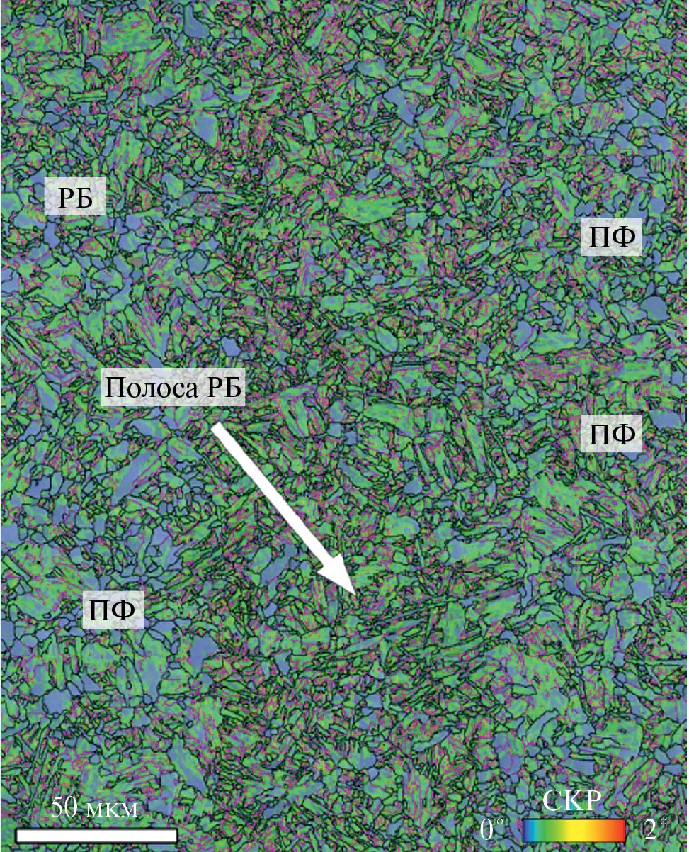 Различия в морфологии, в напряженности ферритной матрицы и в плотности малоугловых границ позволяют отличать РБ от ПФ на EBSD-картах. Характерным признаком РБ на EBSD-картах является повышенная концентрация СКР 1°–2° [21]. Чем больше значения СКР, тем более искаженная кристаллическая решетка наблюдается. Еще одним признаком является различие морфологии границ зерен. При анализе микроструктуры, содержащей как ПФ, так и РБ, за критическую величину угла разориентации высокоугловых границ приняли 15°. Это значение отвечает за все возможные варианты ориентировок реек бейнитного феррита внутри бейнитного пакета [22]. РБ показывает повышенное содержание субграниц 2°–15°. Субграницы в бейнитной составляющей микроструктуры часто имеют форму реек.