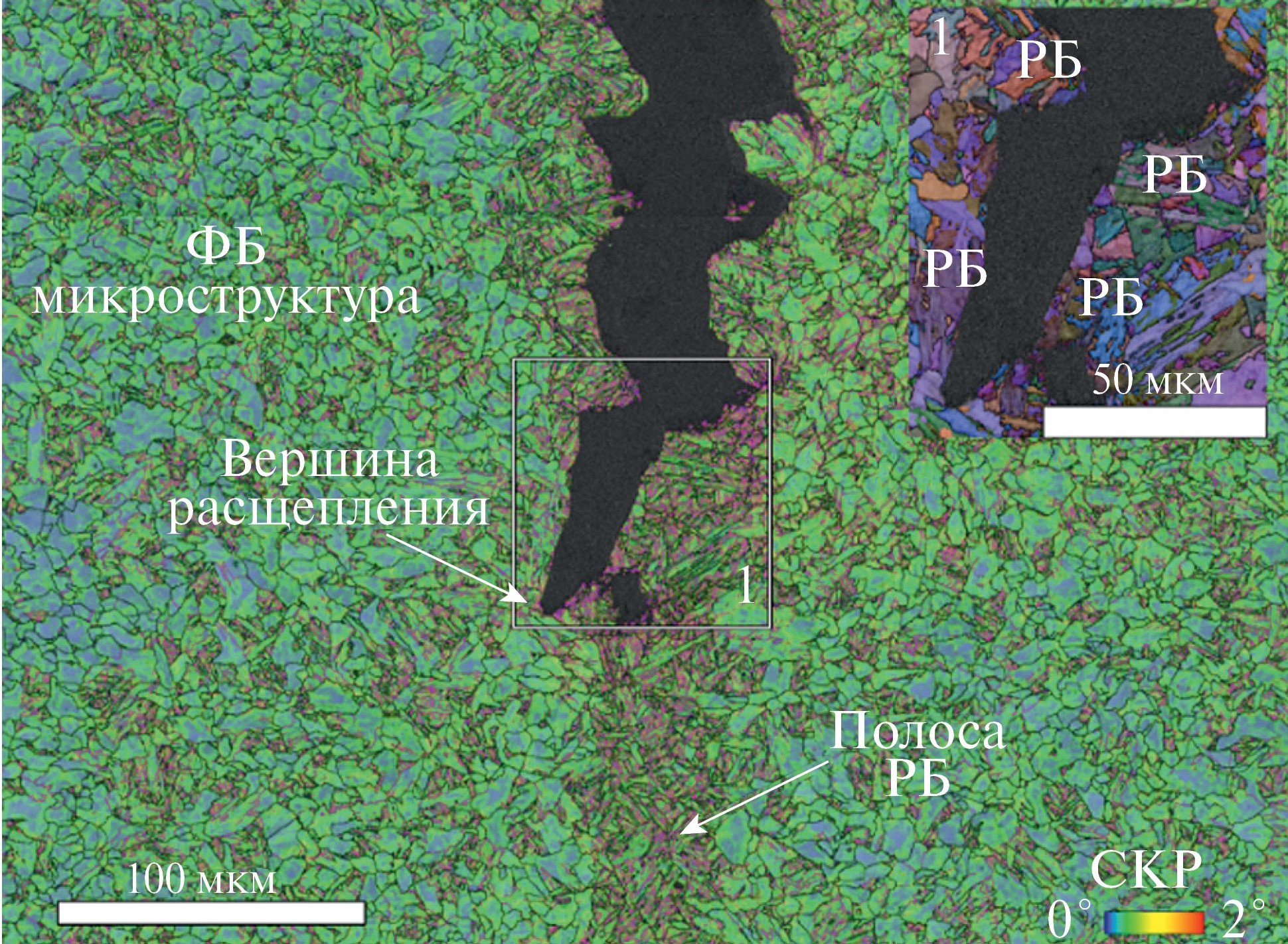 На рис. 11 представлены EBSD-карты пластической зоны в области вершины расщепления. Траектория распространения расщепления лежит внутри полосы, состоящей из РБ. Зернограничное разрушение происходит по границе раздела между пакетами РБ (поле 1 в верхнем правом углу). По обе стороны от расщепления лежат пакеты бейнита с различной кристаллографической ориентацией. Образованию расщепления предшествовала пластическая деформация, о чем свидетельствует повышенная концентрация СКР 1°–2° в окружающей микроструктуре. Вершина самого расщепления затуплена. Данная картина разрушения в вершине расщепления характерна для обеих сталей.
