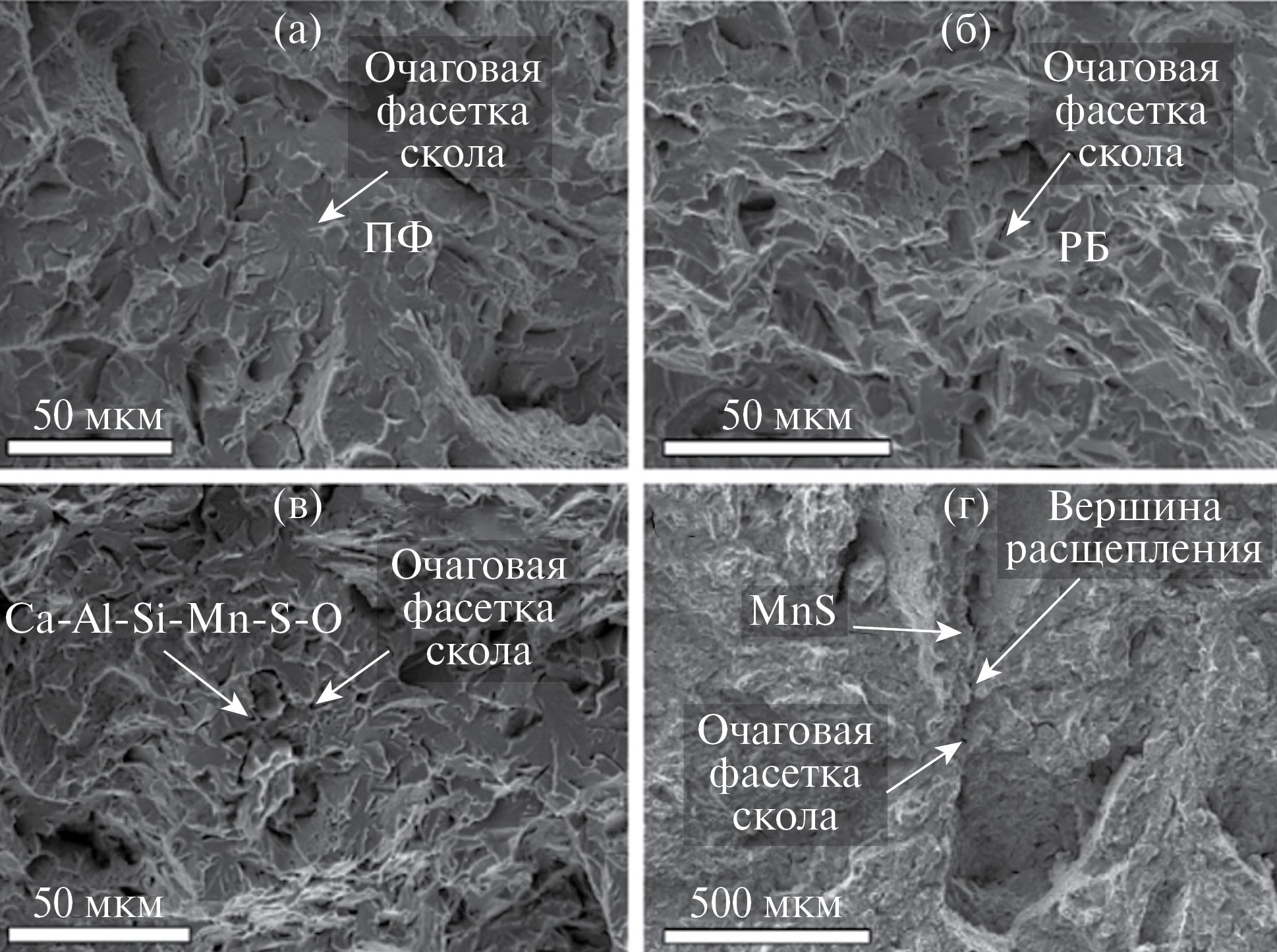При разрушении образцов стали 2 выявлены различные очаги скола по разные стороны от расщеплений (рис. 13а, 13б). Один очаг скола мог быть инициирован неметаллическим включением (рис. 13а), а в другом очаге таковых не наблюдалось (рис. 13б). Большинство очагов скола представляли собой фасетки, фокус разрушения которых располагался вблизи неметаллических включений MnS (рис. 13а). То есть разрушение сколом инициировалось не в самом включении MnS, а в металле пластической зоны вблизи включения. На рис. 13г представлена очаговая фасетка вблизи вершины расщепления, содержащего MnS. Очаговые фасетки могли быть образованы как ферритными зернами (рис. 13а), так и бейнитными пакетами (рис. 13г). Описанные выше наблюдения указывают на превалирующее влияние загрязненности неметаллическими включениями, в особенности MnS, на процесс инициации скола стали 1 при температуре испытаний –80°С.