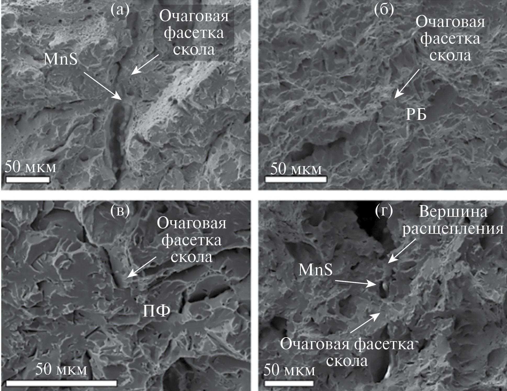 Рис. 13. РЭМ-снимки очагов скола при разрушении металла стали 2 (tисп = -80°C): а, б – очаговые фасетки скола различной природы в образце с расщеплением; в – очаговая фасетка скола без неметаллического включения; г – очаговая фасетка скола с MnS вблизи вершины расщепления.
