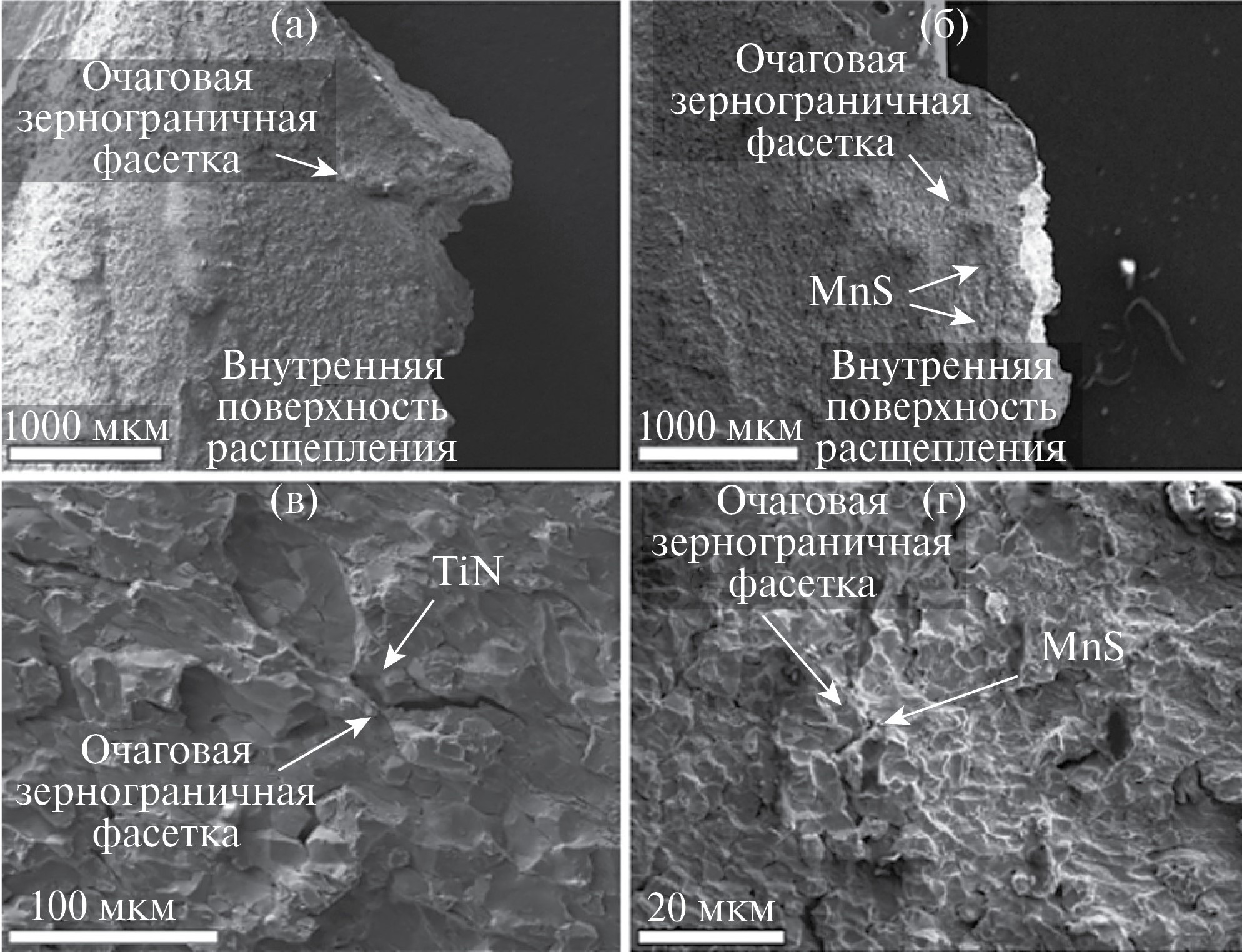 Микрофрактографический анализ внутренних поверхностей расщеплений. Природу образования расщеплений изучали посредством фрактографического исследования (рис. 14). С этой целью в жидком азоте раскрывали их внутренние поверхности в плоскости прокатки. Было изучено по три расщепления от каждой стали. Внутренние поверхности расщеплений для обеих сталей были образованы по механизму хрупкого зернограничного разрушения. Признаком такого типа разрушения является образование фасеток зернограничного излома, обнажающих поверхности границ зерен. В двух из трех случаев в фокусе зернограничного разрушения на очаговой фасетке не наблюдали неметаллических включений, в одном случае наблюдали TiN (рис. 14в).