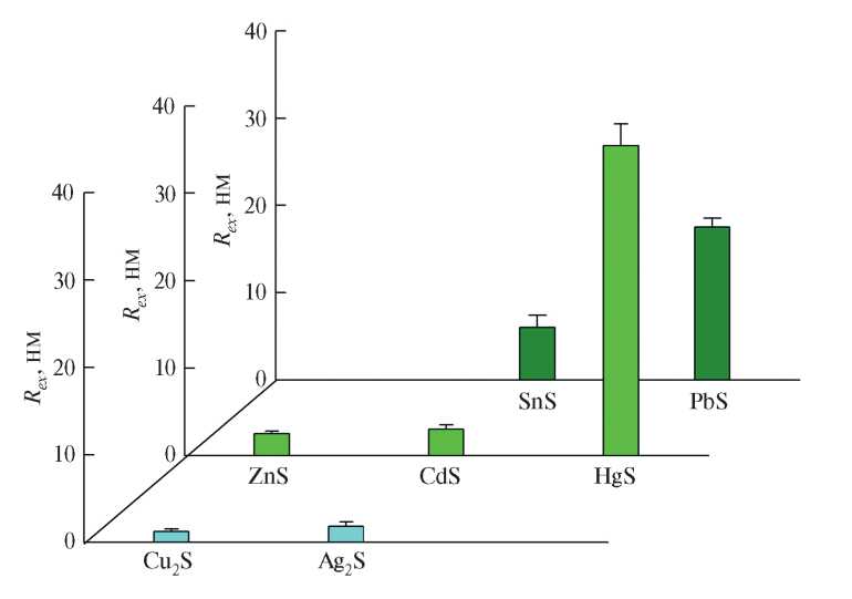 Рис. 1. Изменение размера экситонов Rex в рядах сульфидов Cu2S → Ag2S, ZnS → CdS → HgS и SnS → PbS.