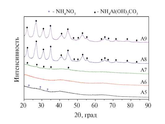 РФА. На рис. 1 представлены дифрактограммы образцов-прекурсоров. В порошках A8 и A9 обнаружена только фаза NH4Al(OH)2CO3 (PDF-2 № 01-071-1314). Уширение пиков свидетельствует о наличии в структуре частиц с размером менее 50 нм. На дифрактограммах образцов А5–А7 присутствуют два широких аморфных гало, что может свидетельствовать о нанокристалличности порошков. На дифрактограмме порошка А5 наблюдаются рефлексы, которые могут свидетельствовать о наличии фазы NH4NO3 (PDF-2 № 00-047-0867). Образец А7 имеет аморфную структуру, на его рентгенограмме также могут быть идентифицированы максимумы, относящиеся к фазе доусонита аммония. Порошки-прекурсоры имеют тенденцию к увеличению кристалличности с увеличением значения рН. Похожая зависимость описана в работе [22].