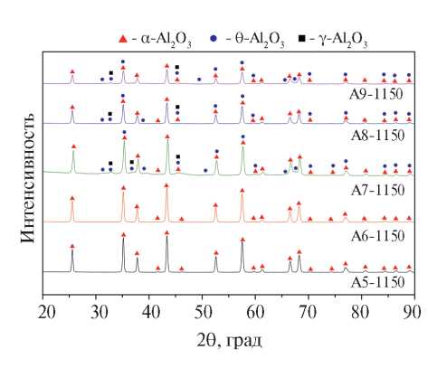 Дифрактограммы образцов после прокаливания при t = 1150°C приведены на рис. 2. В порошках А5-1150 и А6-1150 обнаружена только фаза α-Al2O3 (PDF-2 № 00-046-1212). На дифрактограммах образцов А7-1150–А9-1150 помимо основной фазы α-Al2O3 также наблюдаются отражения примесных фаз θ-Al2O3 (PDF-2 № 01-079-1559) и γ-Al2O3 (PDF-2 № 01-076-4179).
