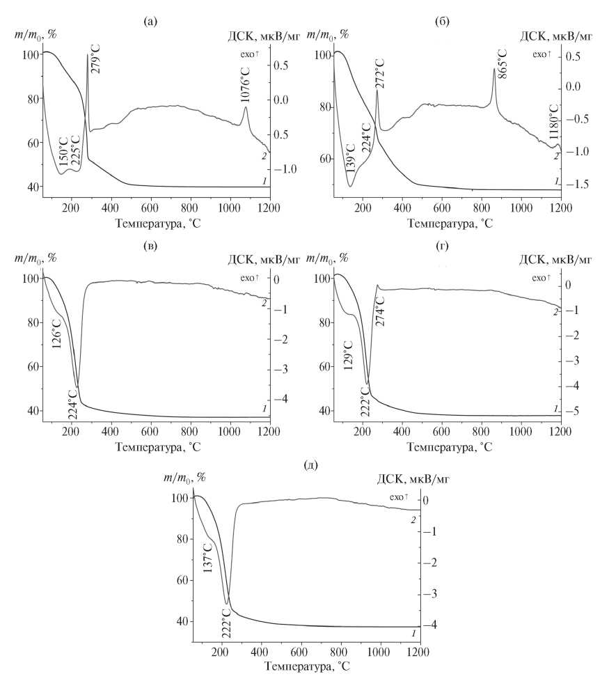 Рис. 3. Кривые ТГ/ДСК порошков AACH: 1 – ТГ, 2 – ДСК; а – А5, б – А6, в – А7, г – А8, д – А9.