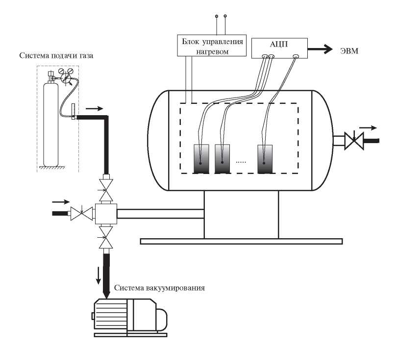 Схема установки, применяемой для реализации процесса синтеза, приведена на рис. 1. Установка представлена вакуумной камерой с возможностью термического нагрева материалов, регулировочным устройством подачи и откачки газов, клапаном выпуска газа, контроллером температуры, вводом термопар и выводом сигнала на аналого-цифровой преобразователь и ЭВМ.