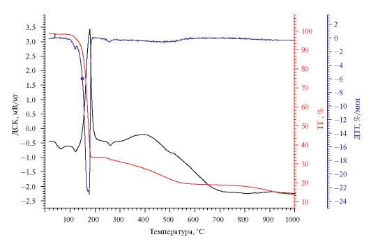 Синхронный термический анализ выполнялся на приборе NETZSCH STA 2500 по следующим режимам: 20°C/5.0°C/мин/100°C и 100°C/10.0°C/мин/1000°C в потоке аргона 50 мл/мин.