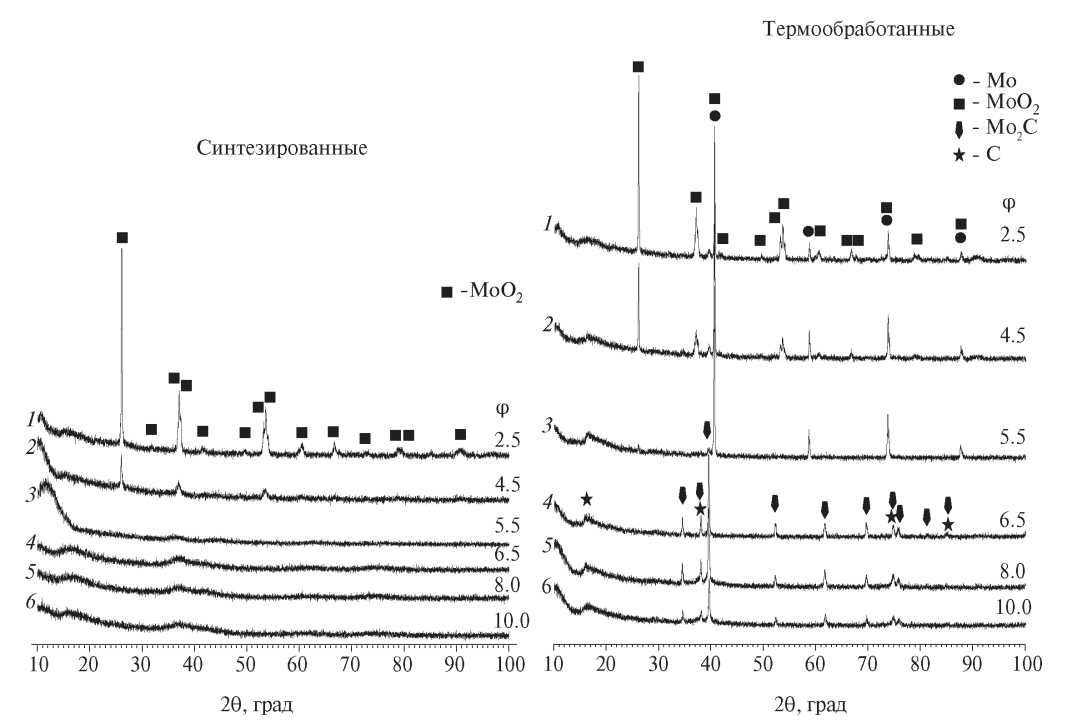 Из вышеприведенных исследований следует, что для повышения количества карбида молибдена необходимо увеличить содержание восстановителя. Исследование фазового состава материалов, полученных при соотношении 10 молей нитрата аммония на 1 моль молибдата аммония и φ = 2.5–10 (рис. 6), показало, что при φ ≥ 5.5 синтезированный материал имеет рентгеноаморфную структуру. Термообработка прекурсора, полученного при φ = 5.5, позволяет синтезировать материал, содержащий более 90% молибдена и около 7% карбида молибдена. При φ ≥ 6.5 после термообработки материал состоит из кристаллической фазы карбида молибдена.